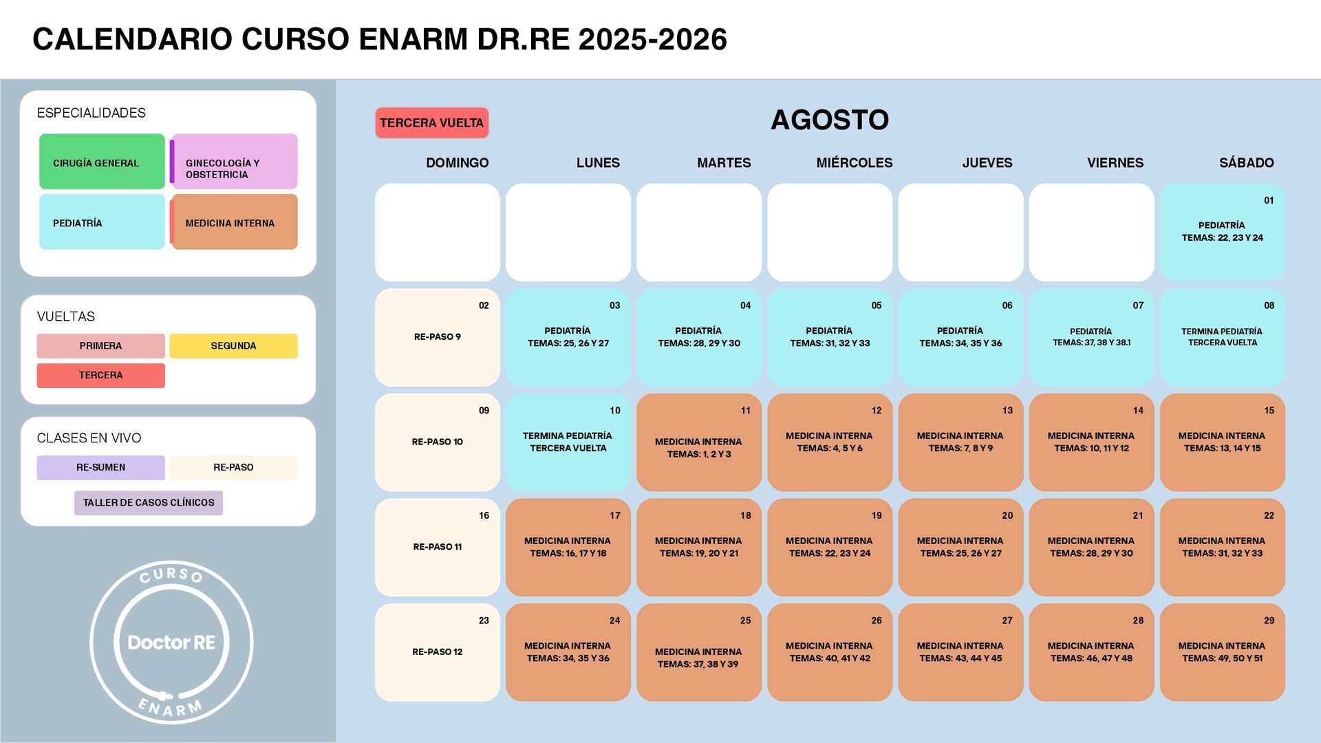 SÁBADO VIERNES JUEVES MIÉRCOLES AGOSTO MARTES LUNES DOMINGO 02 09 16 23 PRIMERA SEGUNDA TERCERA VUELTAS ESPECIALIDADES CIRUGÍA GENERAL GINECOLOGÍA Y OBSTETRICIA PEDIATRÍA MEDICINA INTERNA CALENDARIO CURSO ENARM DR.RE 2025-2026 RE-SUMEN RE-PASO CLASES EN VIVO TALLER DE CASOS CLÍNICOS MEDICINA INTERNA TEMAS: 28, 29 Y 30 MEDICINA INTERNA TEMAS: 25, 26 Y 27 21 20 MEDICINA INTERNA TEMAS: 31, 32 Y 33 22 MEDICINA INTERNA TEMAS: 34, 35 Y 36 24 MEDICINA INTERNA TEMAS: 49, 50 Y 51 MEDICINA INTERNA TEMAS: 46, 47 Y 48 MEDICINA INTERNA TEMAS: 43, 44 Y 45 MEDICINA INTERNA TEMAS: 40, 41 Y 42 MEDICINA INTERNA TEMAS: 37, 38 Y 39 29 28 27 26 25 PEDIATRÍA TEMAS: 22, 23 Y 24 01 PEDIATRÍA TEMAS: 31, 32 Y 33 PEDIATRÍA TEMAS: 28, 29 Y 30 PEDIATRÍA TEMAS: 25, 26 Y 27 05 04 03 PEDIATRÍA TEMAS: 37, 38 Y 38.1 PEDIATRÍA TEMAS: 34, 35 Y 36 07 06 TERMINA PEDIATRÍA TERCERA VUELTA 08 TERMINA PEDIATRÍA TERCERA VUELTA 10 MEDICINA INTERNA TEMAS: 13, 14 Y 15 MEDICINA INTERNA TEMAS: 10, 11 Y 12 MEDICINA INTERNA TEMAS: 7, 8 Y 9 MEDICINA INTERNA TEMAS: 4, 5 Y 6 MEDICINA INTERNA TEMAS: 1, 2 Y 3 15 14 13 12 11 MEDICINA INTERNA TEMAS: 19, 20 Y 21 MEDICINA INTERNA TEMAS: 16, 17 Y 18 18 17 MEDICINA INTERNA TEMAS: 22, 23 Y 24 19