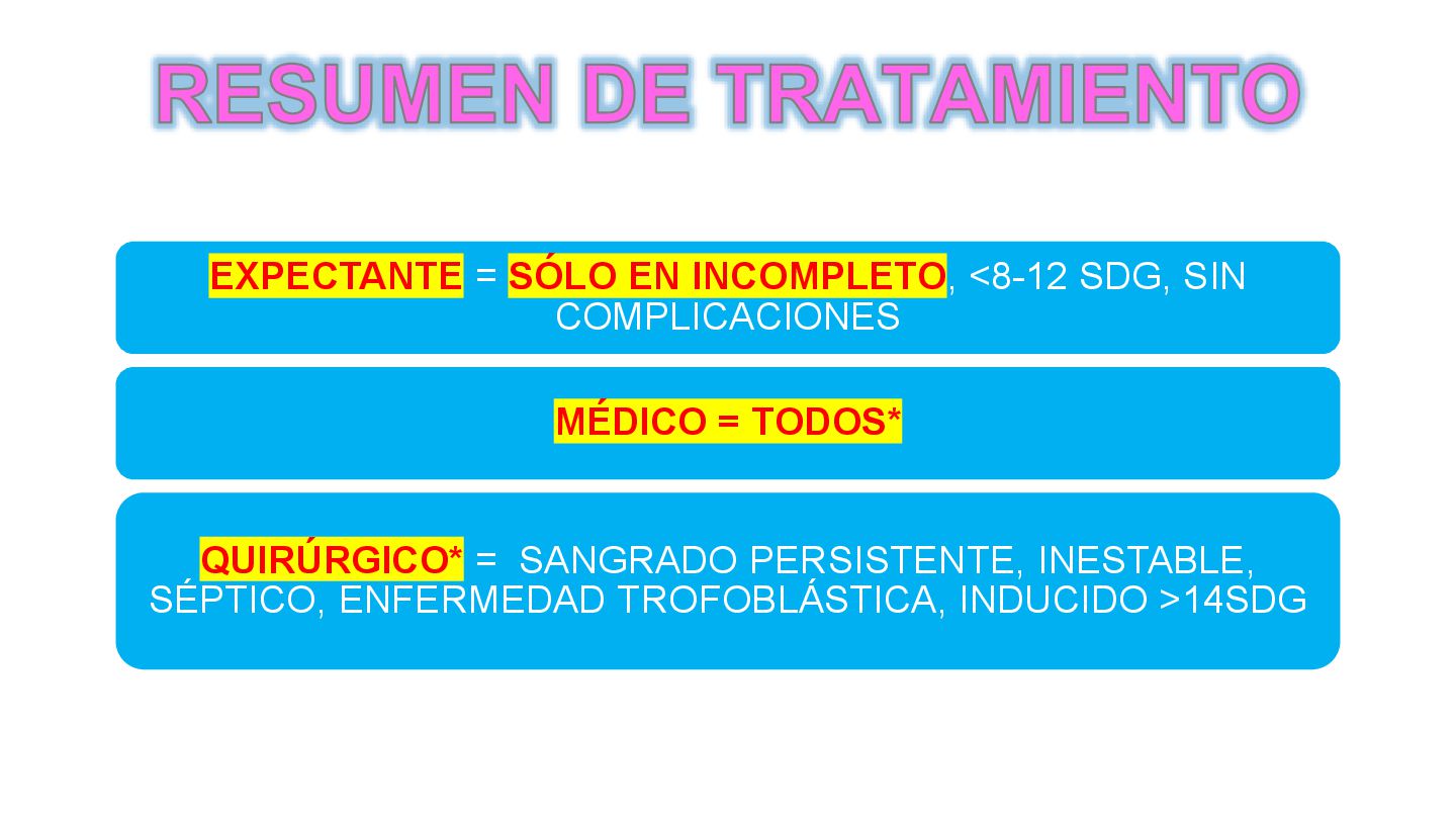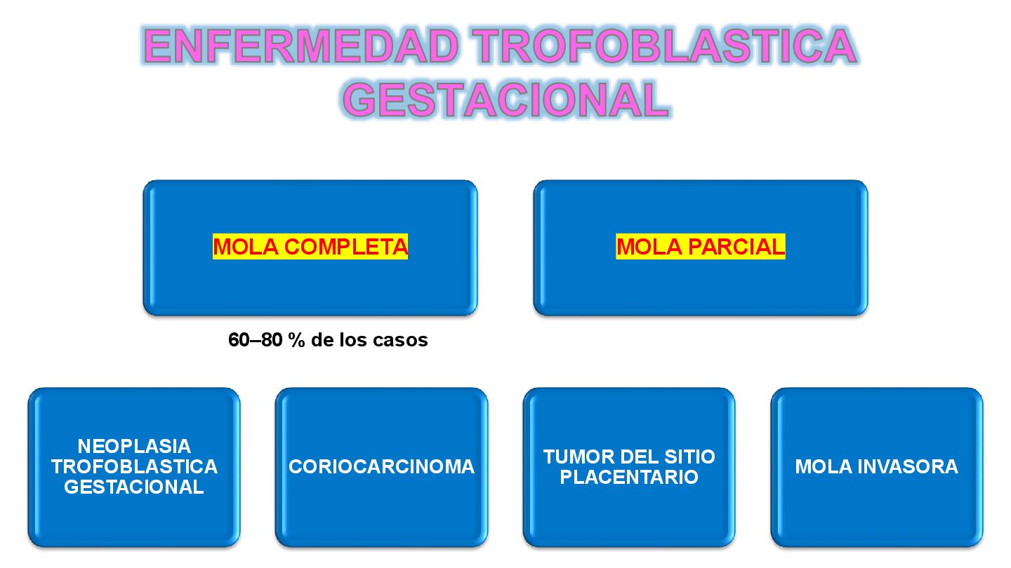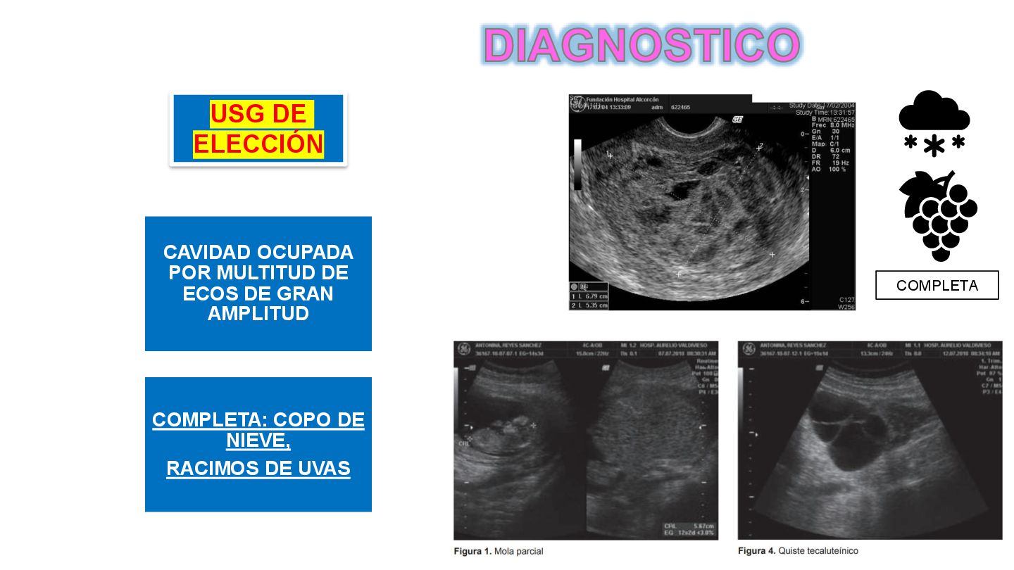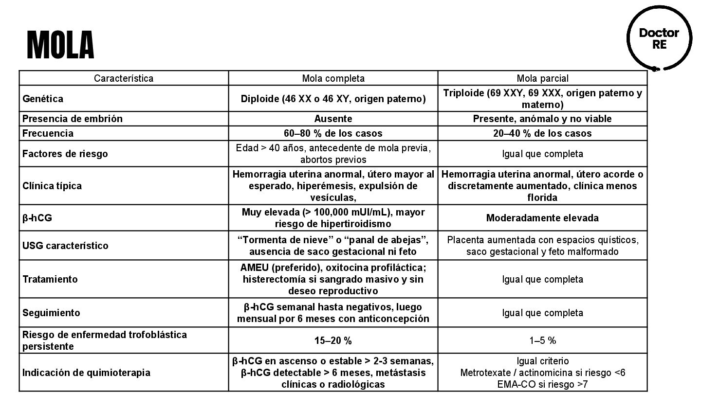 o 46 XY, origen paterno) Triploide (69 XXY, 69 XXX, origen paterno y materno) Presencia de embrión Ausente Presente, anómalo y no viable Frecuencia 60–80 % de los casos 20–40 % de los casos Factores de riesgo Edad > 40 años, antecedente de mola previa, abortos previos Igual que completa Clínica típica Hemorragia uterina anormal, útero mayor al esperado, hiperémesis, expulsión de vesículas, Hemorragia uterina anormal, útero acorde o discretamente aumentado, clínica menos florida β-hCG Muy elevada (> 100,000 mUI/mL), mayor riesgo de hipertiroidismo Moderadamente elevada USG característico “Tormenta de nieve” o “panal de abejas”, ausencia de saco gestacional ni feto Placenta aumentada con espacios quísticos, saco gestacional y feto malformado Tratamiento AMEU (preferido), oxitocina profiláctica; histerectomía si sangrado masivo y sin deseo reproductivo Igual que completa Seguimiento β-hCG semanal hasta negativos, luego mensual por 6 meses con anticoncepción Igual que completa Riesgo de enfermedad trofoblástica persistente 15–20 % 1–5 % Indicación de quimioterapia β-hCG en ascenso o estable > 2-3 semanas, β-hCG detectable > 6 meses, metástasis clínicas o radiológicas Igual criterio Metrotexate / actinomicina si riesgo <6 EMA-CO si riesgo >7