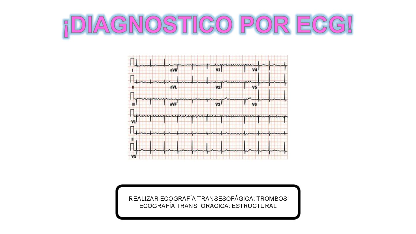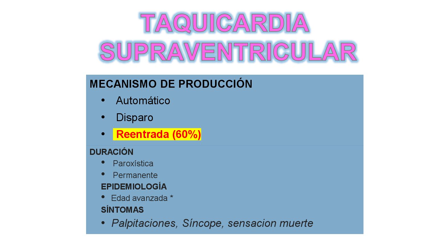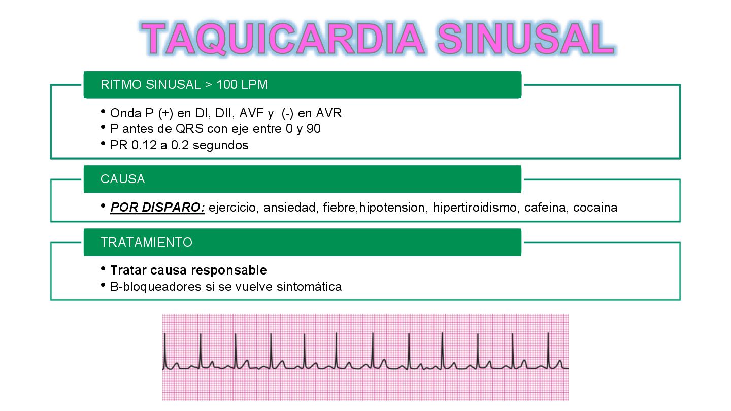 en AVR • P antes de QRS con eje entre 0 y 90 • PR 0.12 a 0.2 segundos RITMO SINUSAL > 100 LPM • POR DISPARO: ejercicio, ansiedad, fiebre,hipotension, hipertiroidismo, cafeina, cocaina CAUSA • Tratar causa responsable • B-bloqueadores si se vuelve sintomática TRATAMIENTO TAQUICARDIA SINUSAL