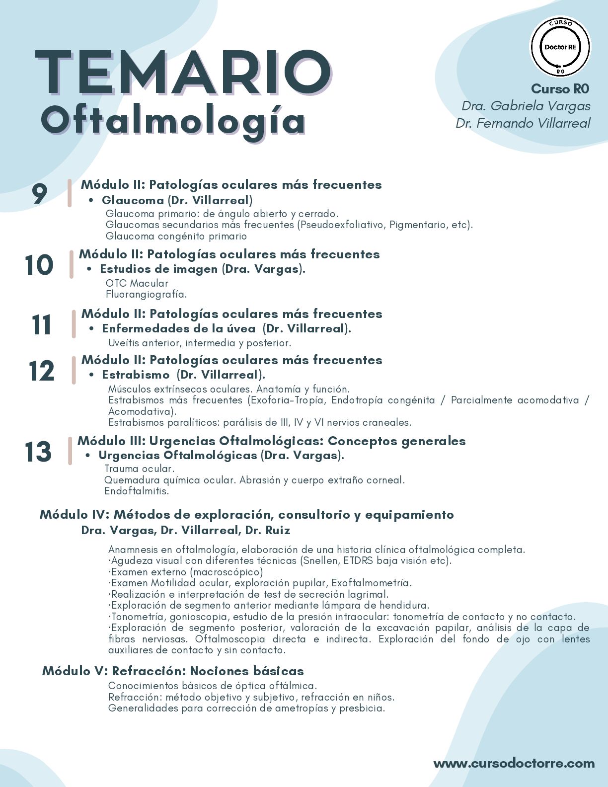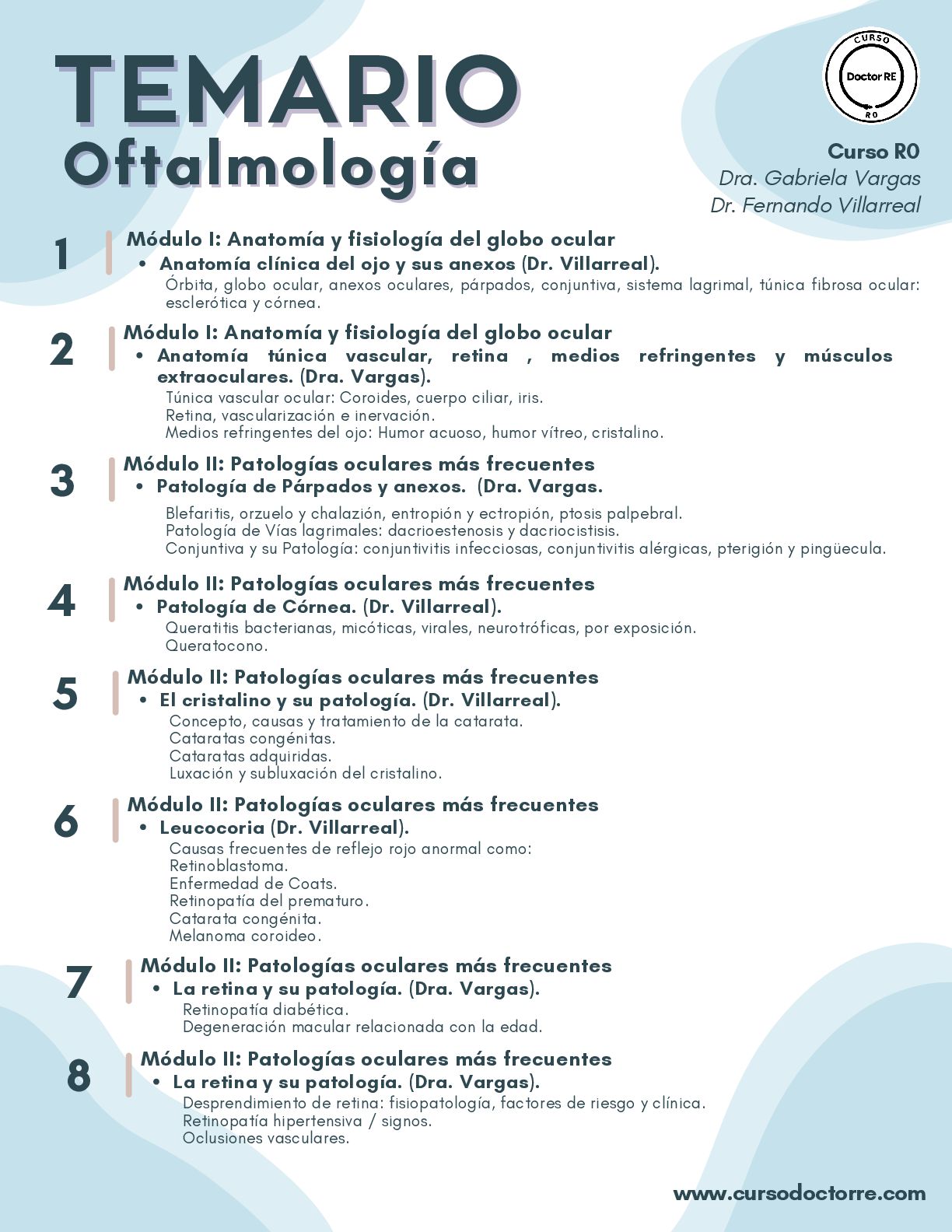 I: Anatomía y fisiología del globo ocular Anatomía clínica del ojo y sus anexos (Dr. Villarreal). www.cursodoctorre.com TEMARIO TEMARIO Oftalmología Oftalmología Módulo I: Anatomía y fisiología del globo ocular 2 Anatomía túnica vascular, retina , medios refringentes y músculos extraoculares. (Dra. Vargas). Módulo II: Patologías oculares más frecuentes 3 Patología de Párpados y anexos. (Dra. Vargas. Módulo II: Patologías oculares más frecuentes 4 Patología de Córnea. (Dr. Villarreal). Órbita, globo ocular, anexos oculares, párpados, conjuntiva, sistema lagrimal, túnica fibrosa ocular: esclerótica y córnea. Túnica vascular ocular: Coroides, cuerpo ciliar, iris. Retina, vascularización e inervación. Medios refringentes del ojo: Humor acuoso, humor vítreo, cristalino. Blefaritis, orzuelo y chalazión, entropión y ectropión, ptosis palpebral. Patología de Vías lagrimales: dacrioestenosis y dacriocistisis. Conjuntiva y su Patología: conjuntivitis infecciosas, conjuntivitis alérgicas, pterigión y pingüecula. Queratitis bacterianas, micóticas, virales, neurotróficas, por exposición. Queratocono. Módulo II: Patologías oculares más frecuentes 5 El cristalino y su patología. (Dr. Villarreal). Concepto, causas y tratamiento de la catarata. Cataratas congénitas. Cataratas adquiridas. Luxación y subluxación del cristalino. Módulo II: Patologías oculares más frecuentes 6 Leucocoria (Dr. Villarreal). Causas frecuentes de reflejo rojo anormal como: Retinoblastoma. Enfermedad de Coats. Retinopatía del prematuro. Catarata congénita. Melanoma coroideo. Módulo II: Patologías oculares más frecuentes 7 La retina y su patología. (Dra. Vargas). Retinopatía diabética. Degeneración macular relacionada con la edad. Módulo II: Patologías oculares más frecuentes 8 La retina y su patología. (Dra. Vargas). Desprendimiento de retina: fisiopatología, factores de riesgo y clínica. Retinopatía hipertensiva / signos. Oclusiones vasculares.