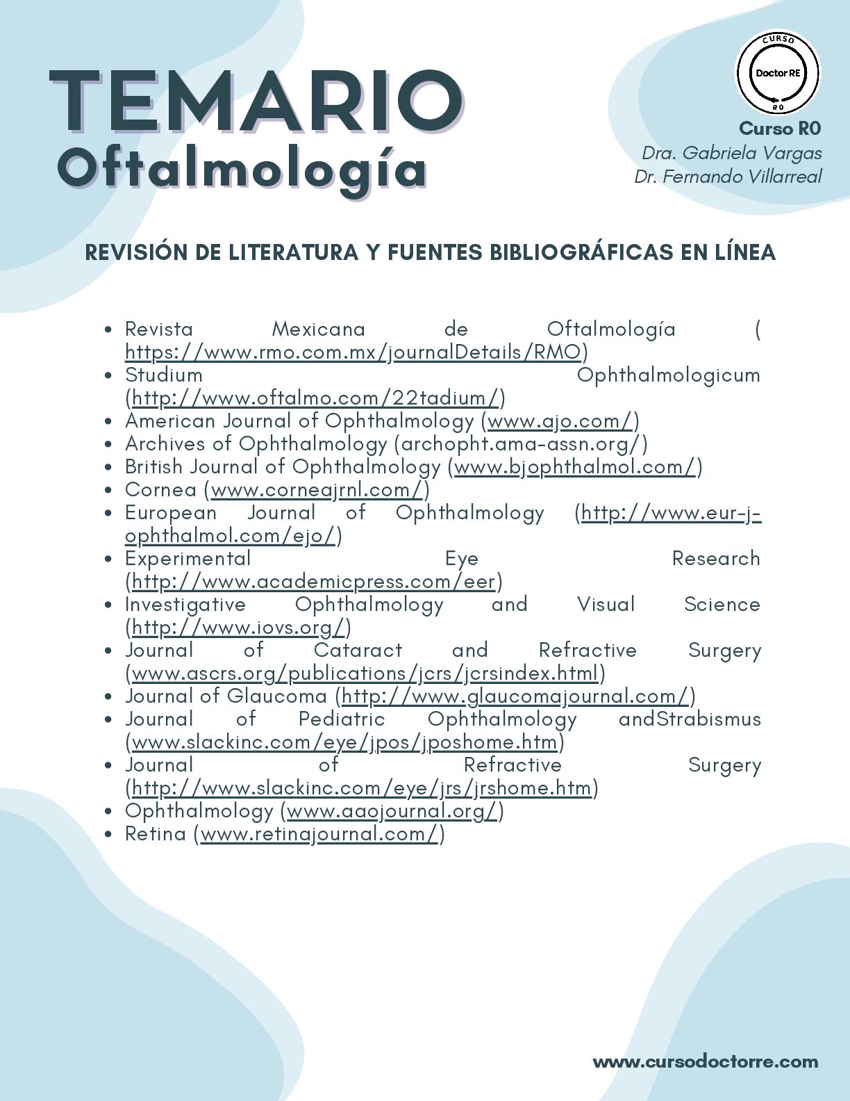 LITERATURA Y FUENTES BIBLIOGRÁFICAS EN LÍNEA www.cursodoctorre.com TEMARIO TEMARIO Oftalmología Oftalmología Revista Mexicana de Oftalmología ( https://www.rmo.com.mx/journalDetails/RMO) Studium Ophthalmologicum (http://www.oftalmo.com/22tadium/) American Journal of Ophthalmology (www.ajo.com/) Archives of Ophthalmology (archopht.ama-assn.org/) British Journal of Ophthalmology (www.bjophthalmol.com/) Cornea (www.corneajrnl.com/) European Journal of Ophthalmology (http://www.eur-j- ophthalmol.com/ejo/) Experimental Eye Research (http://www.academicpress.com/eer) Investigative Ophthalmology and Visual Science (http://www.iovs.org/) Journal of Cataract and Refractive Surgery (www.ascrs.org/publications/jcrs/jcrsindex.html) Journal of Glaucoma (http://www.glaucomajournal.com/) Journal of Pediatric Ophthalmology andStrabismus (www.slackinc.com/eye/jpos/jposhome.htm) Journal of Refractive Surgery (http://www.slackinc.com/eye/jrs/jrshome.htm) Ophthalmology (www.aaojournal.org/) Retina (www.retinajournal.com/)