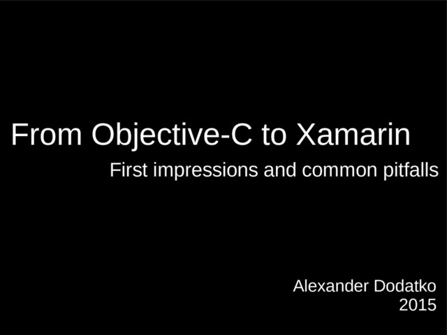 This talk is about sharing my experience and impressions about the Xamarin platform. It also covers some common mistakes made by obj-c guys who are switching to C#.
