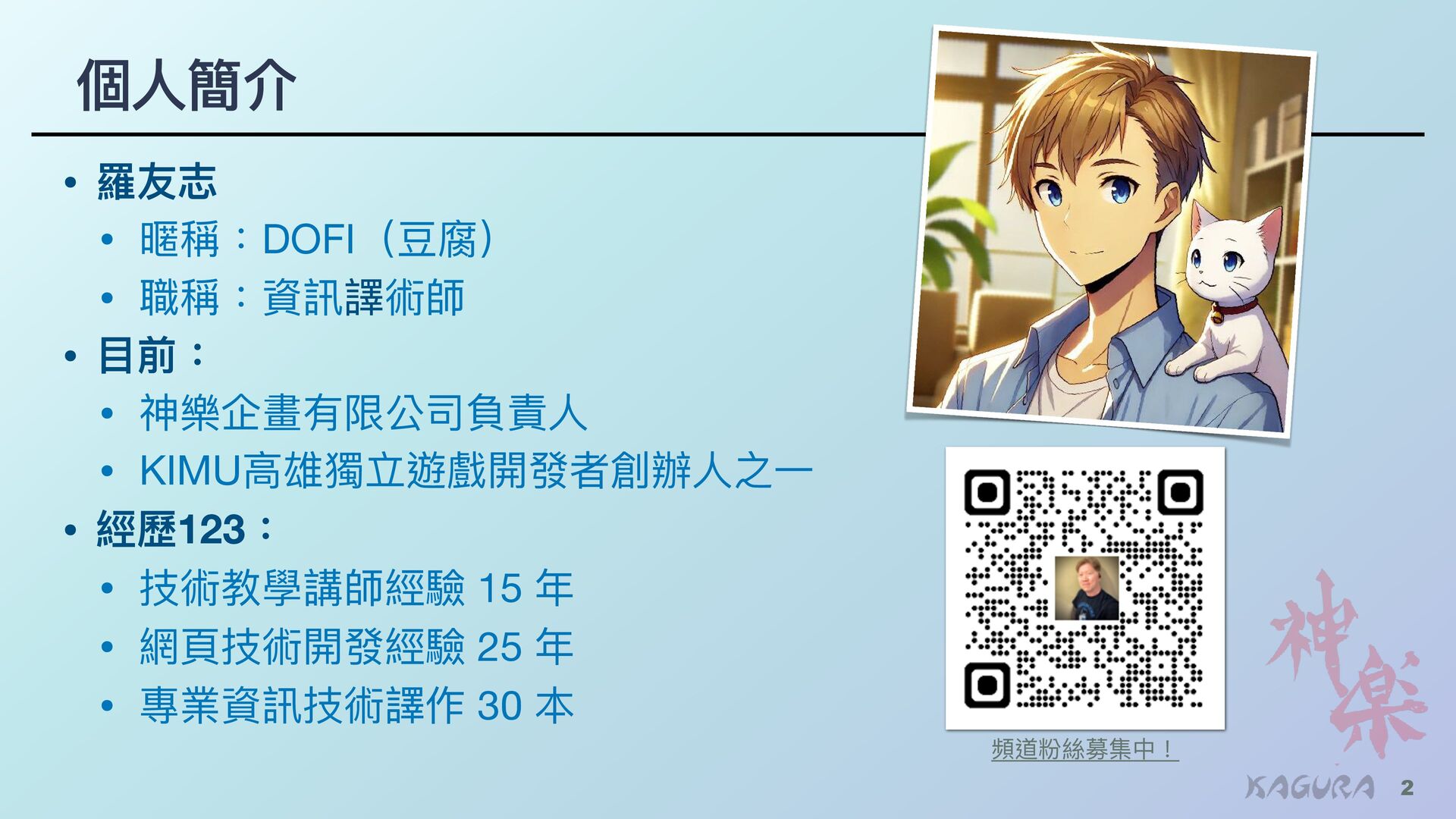 職稱:資訊譯術師 • 目 前: • 神樂企畫有限公司負責 人 • KIMU 高 雄獨立遊戲開發者創辦 人 之 一 • 經歷123: • 技術教學講師經驗 15 年 • 網 頁 技術開發經驗 25 年 • 專業資訊技術譯作 30 本 2 頻道粉絲募集中!