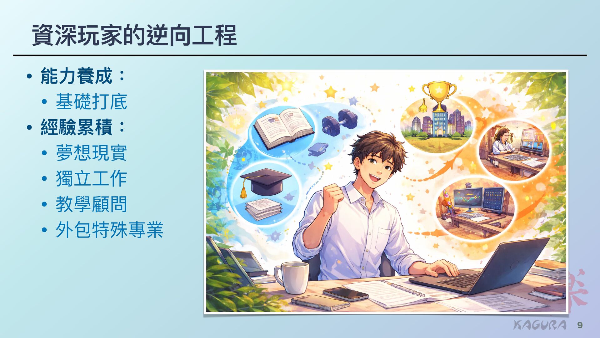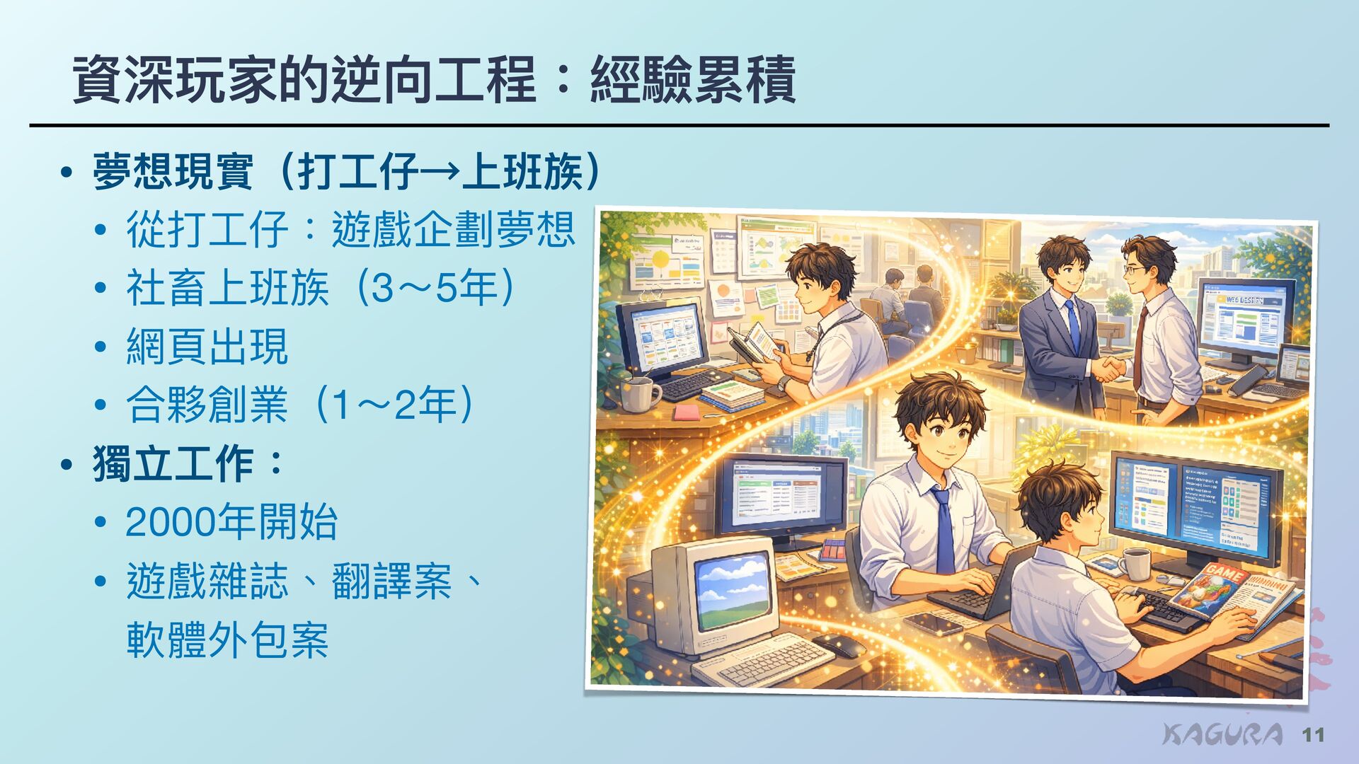 資深玩家的逆向 工 程:經驗累積 • 夢想現實(打 工 仔→上班族) • 從打 工