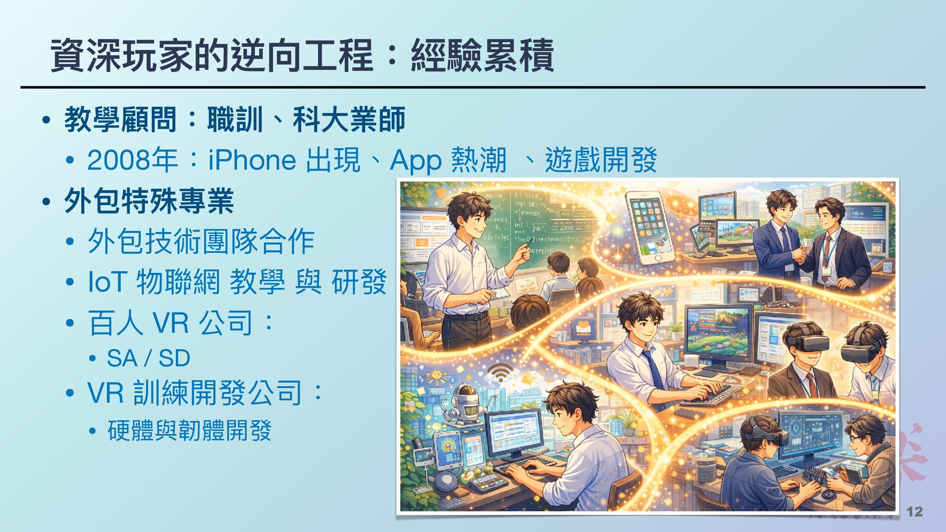 資深玩家的逆向 工 程:經驗累積 • 教學顧問:職訓、科 大 業師 • 2008年:iPhone 出現、App