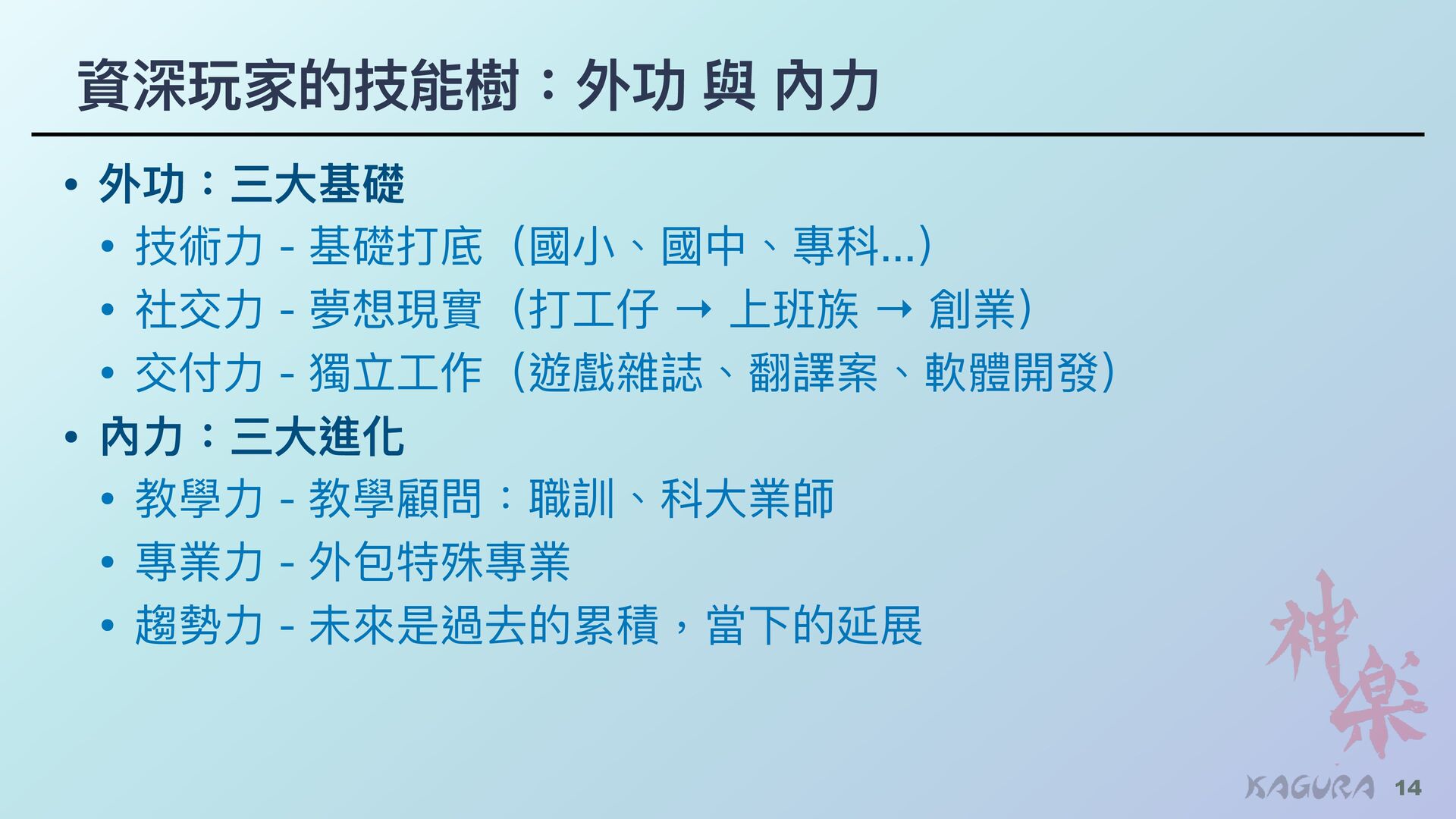 力 - 基礎打底(國 小 、國中、專科...) • 社交 力 - 夢想現實(打 工 仔 → 上班族 → 創業) • 交付 力 - 獨立 工 作(遊戲雜誌、翻譯案、軟體開發) • 內 力 :三 大 進化 • 教學 力 - 教學顧問:職訓、科 大 業師 • 專業 力 - 外包特殊專業 • 趨勢 力 - 未來是過去的累積,當下的延展 14
