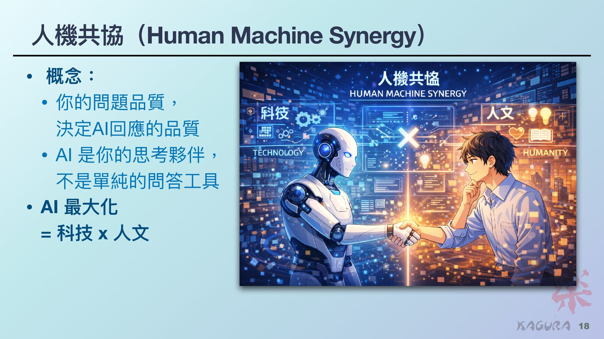 AI 是你的思考夥伴, 不是單純的問答 工 具 • AI 最 大 化 = 科技 x 人文 18
