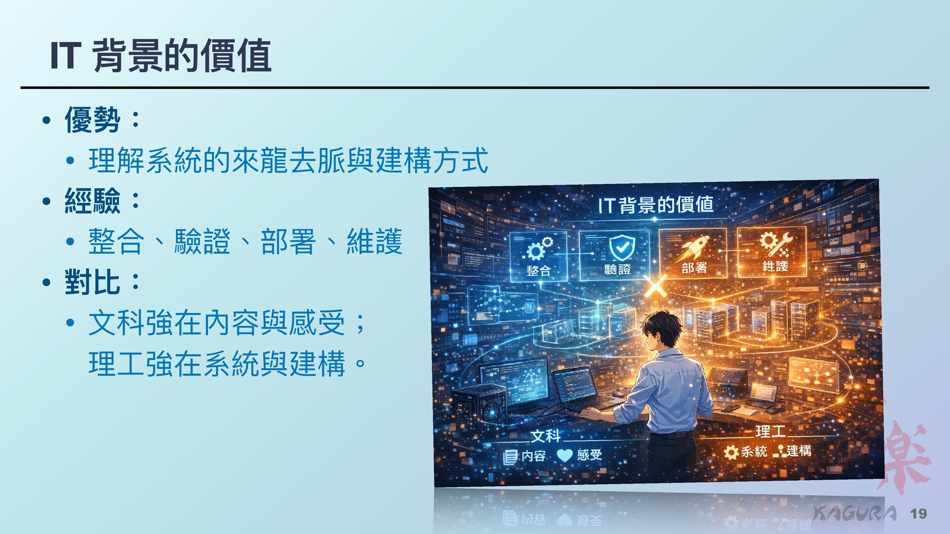 IT 背景的價值 • 優勢: • 理解系統的來龍去脈與建構 方 式 • 經驗: