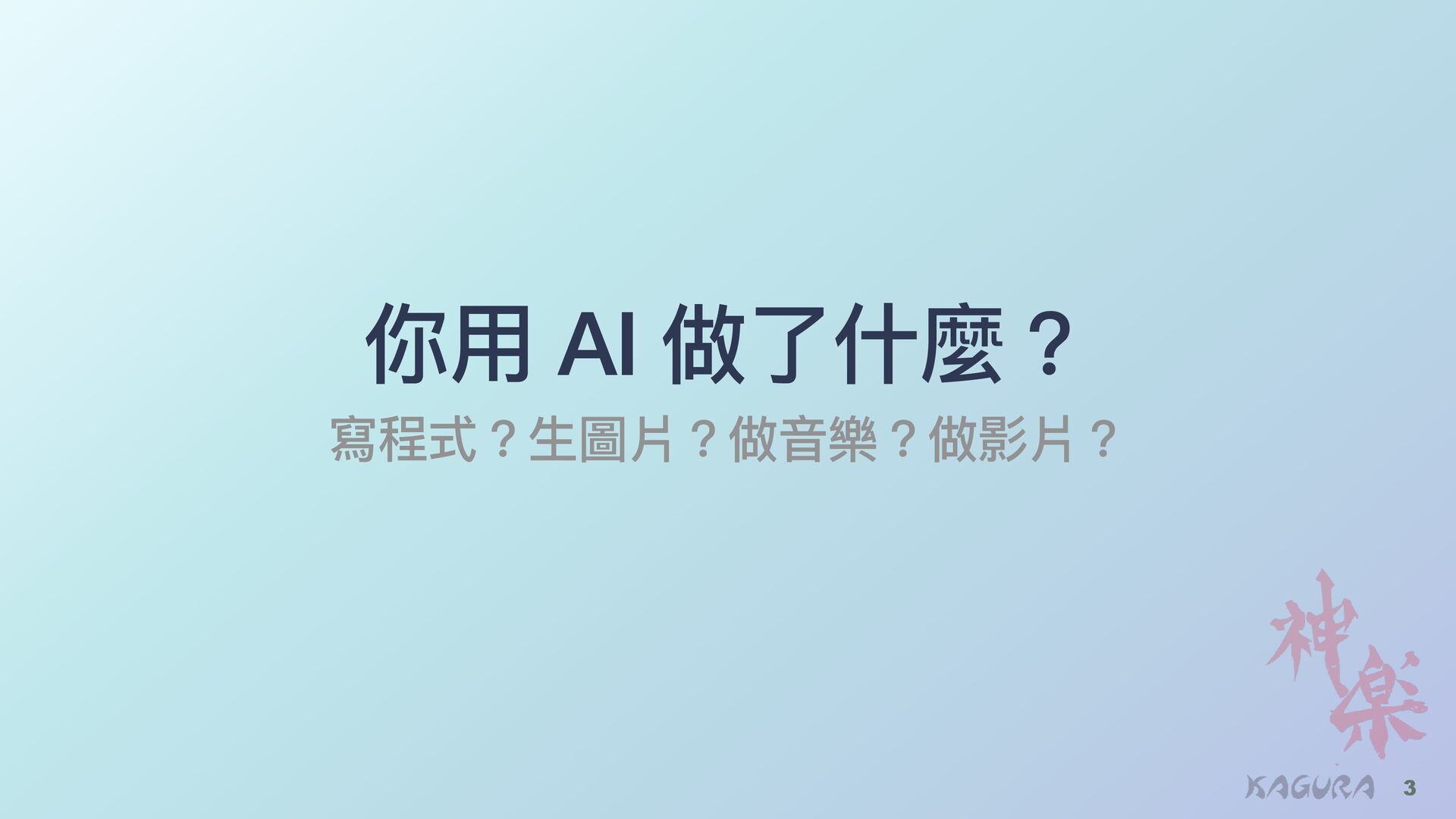 你 用 AI 做了什麼? 3 寫程式? 生 圖片?做 音 樂?做影片?