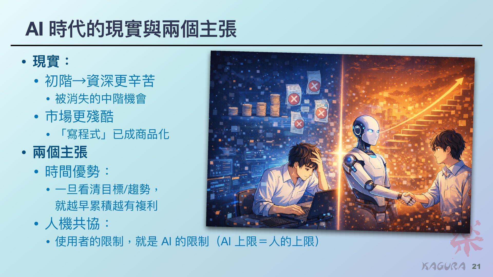 AI 時代的現實與兩個主張 • 現實: • 初階→資深更辛苦 • 被消失的中階機會 • 市場更殘酷
