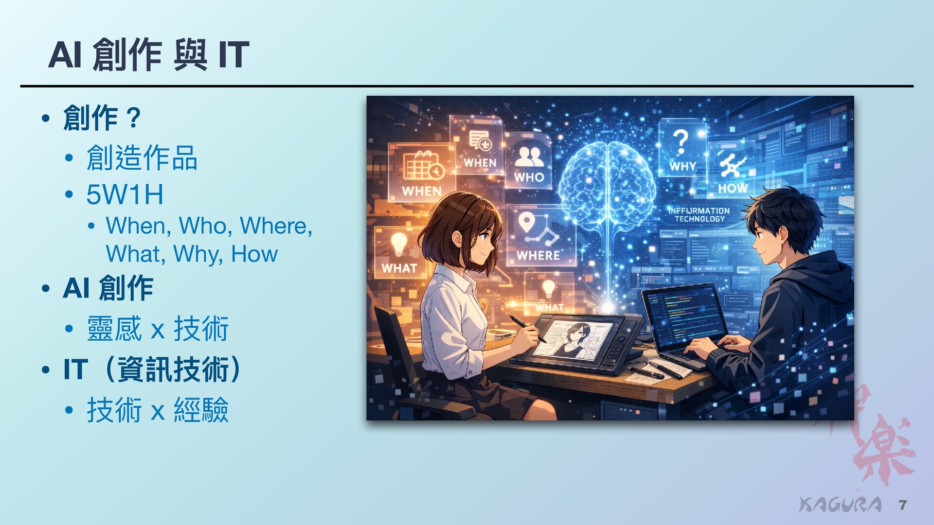 • When, Who, Where, What, Why, How • AI 創作 • 靈感 x 技術 • IT(資訊技術) • 技術 x 經驗 7