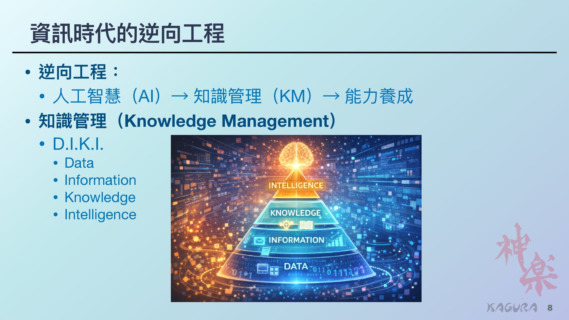 知識管理(KM)→ 能 力 養成 • 知識管理(Knowledge Management) • D.I.K.I. • Data • Information • Knowledge • Intelligence 8