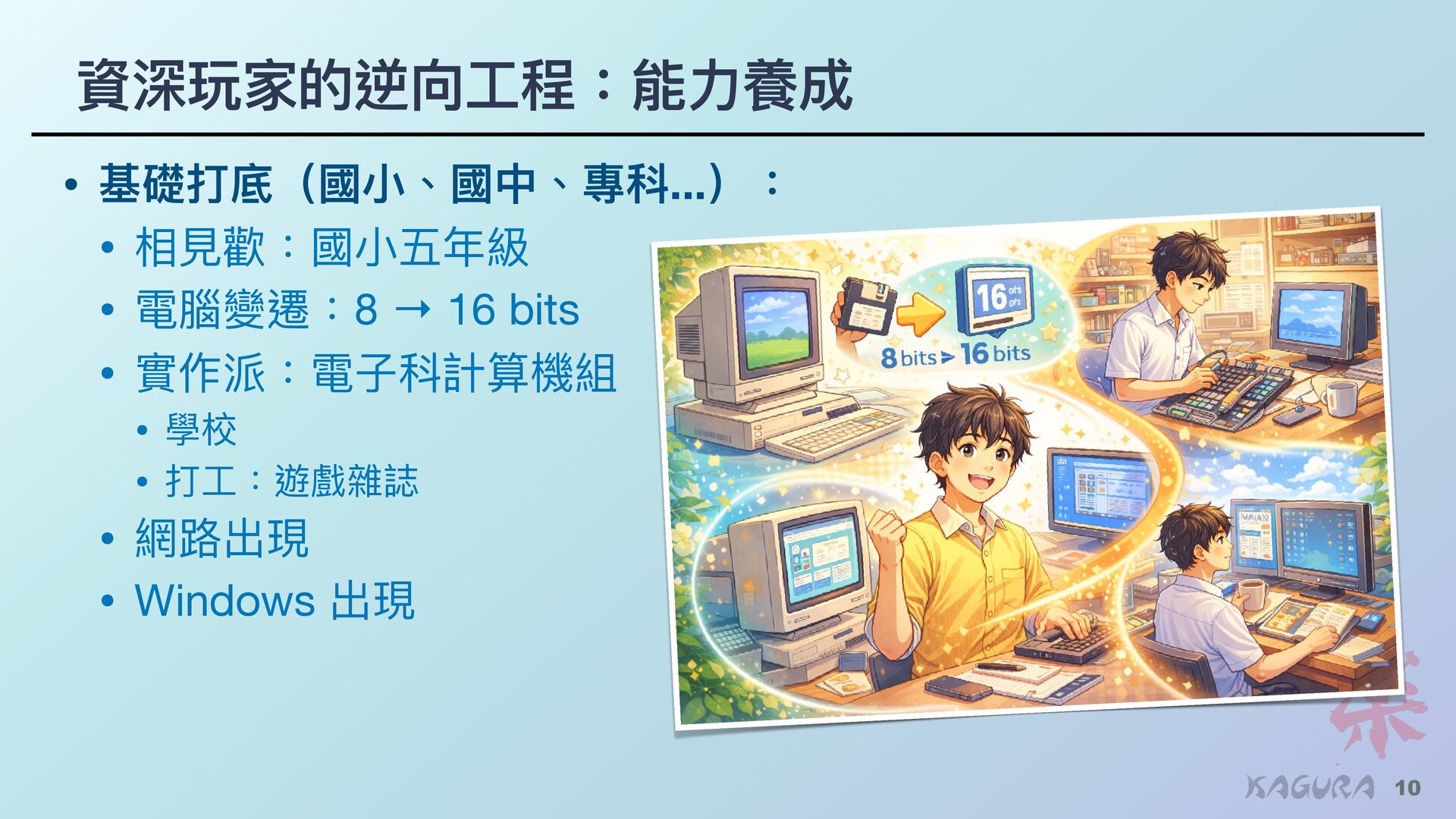 相 見 歡:國 小 五年級 • 電腦變遷:8 → 16 bits • 實作派:電 子 科計算機組 • 學校 • 打 工 :遊戲雜誌 • 網路出現 • Windows 出現 10