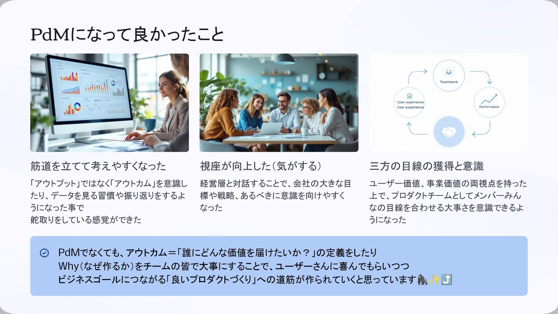 ユーザー価値、事業価値の両視点を持った 上で、プロダクトチームとしてメンバーみん なの目線を合わせる大事さを意識できるよ うになった PdMでなくても、アウトカム=「誰にどんな価値を届けたいか?」の定義をしたり Why(なぜ作るか)をチームの皆で大事にすることで、ユーザーさんに喜んでもらいつつ ビジネスゴールにつながる「良いプロダクトづくり」への道筋が作られていくと思っています🦍✨⤴ PdMになって良かったこと