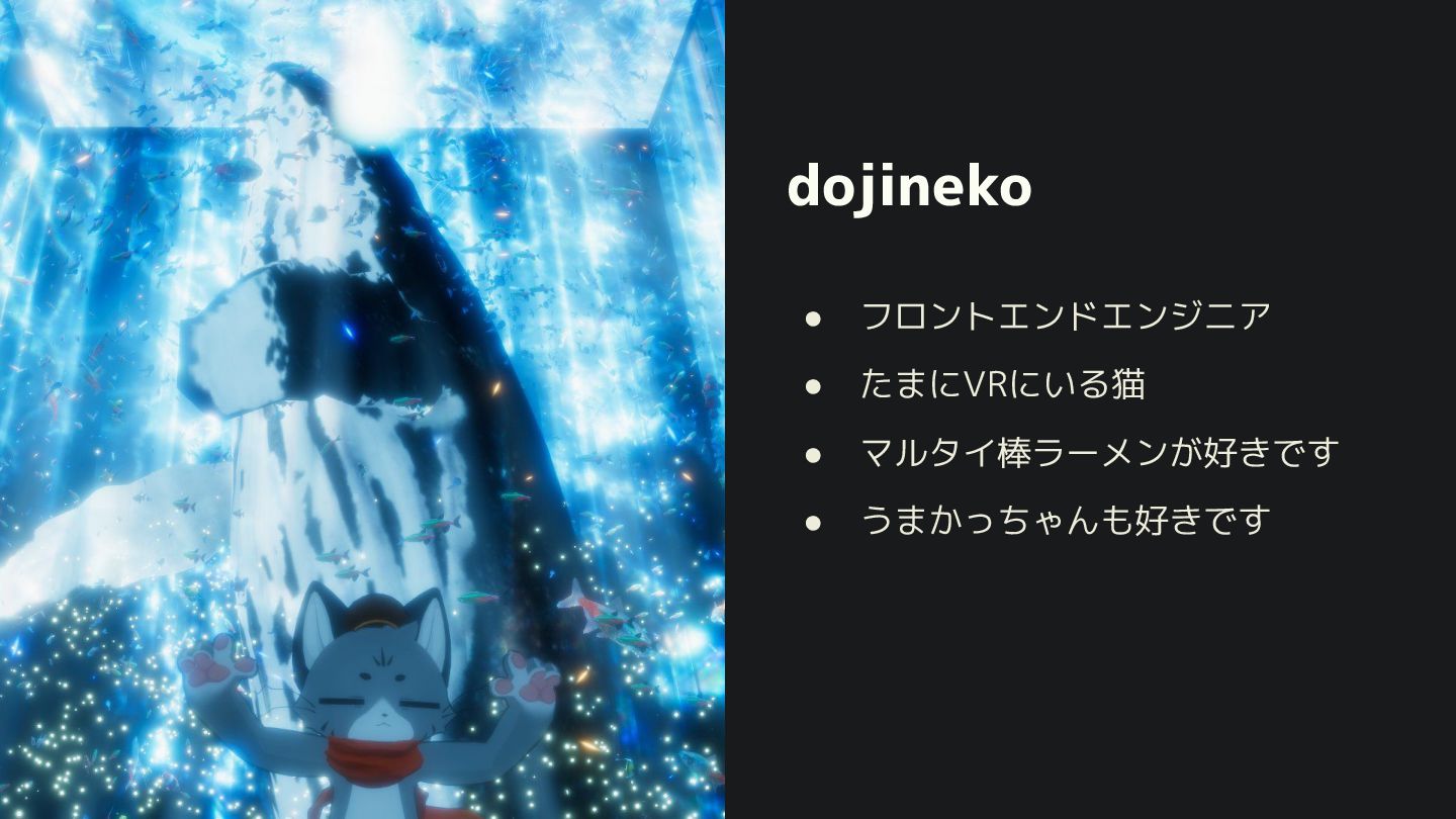 dojineko • フロントエンドエンジニア • たまにVRにいる猫 • マルタイ棒ラーメンが好きです • うまかっちゃんも好きです