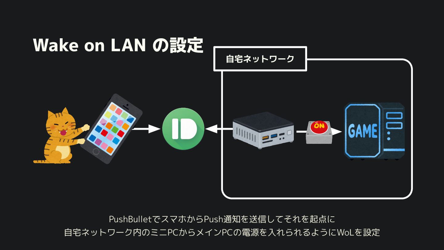 Wake on LAN の設定 PushBulletでスマホからPush通知を送信してそれを起点に 自宅ネットワーク内のミニPCからメインPCの電源を入れられるようにWoLを設定 自宅ネットワーク