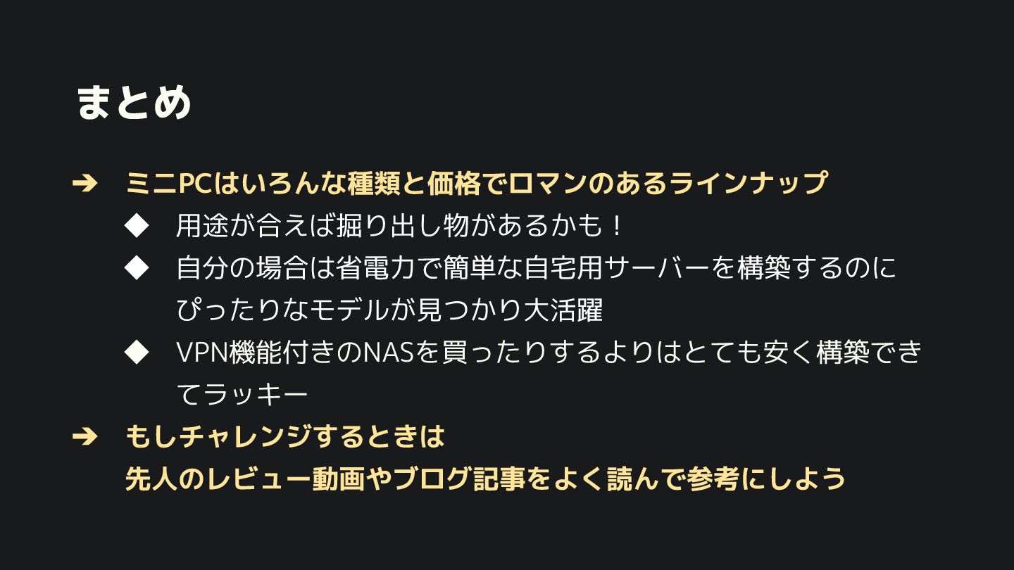 まとめ ➔ ミニPCはいろんな種類と価格でロマンのあるラインナップ ◆ 用途が合えば掘り出し物があるかも! ◆ 自分の場合は省電力で簡単な自宅用サーバーを構築するのに ぴったりなモデルが見つかり大活躍 ◆ VPN機能付きのNASを買ったりするよりはとても安く構築でき