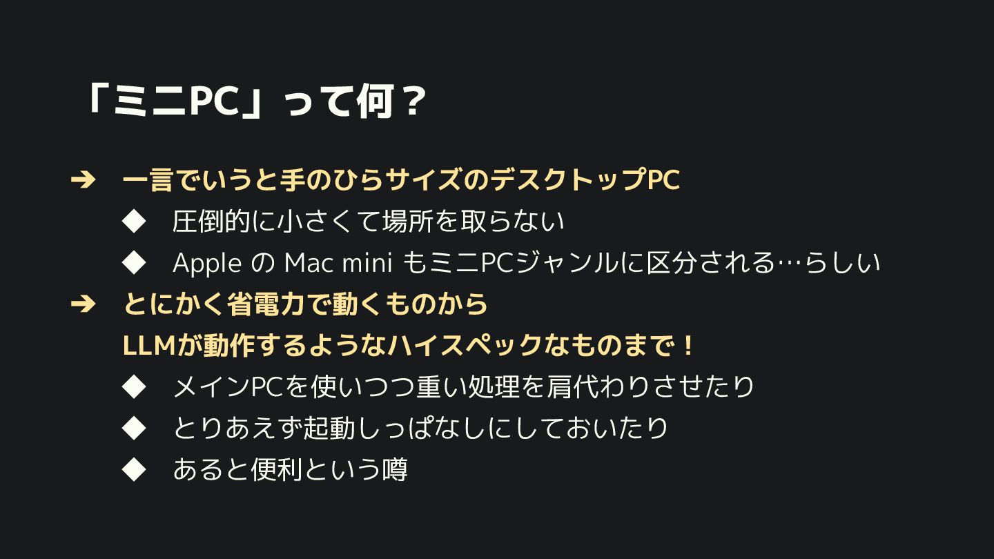 もミニPCジャンルに区分される…らしい ➔ とにかく省電力で動くものから LLMが動作するようなハイスペックなものまで! ◆ メインPCを使いつつ重い処理を肩代わりさせたり ◆ とりあえず起動しっぱなしにしておいたり ◆ あると便利という噂