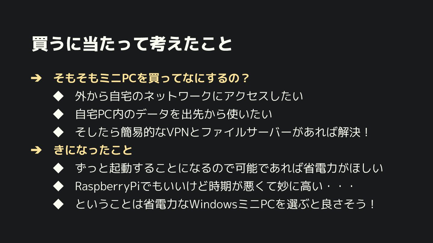 買うに当たって考えたこと ➔ そもそもミニPCを買ってなにするの? ◆ 外から自宅のネットワークにアクセスしたい ◆ 自宅PC内のデータを出先から使いたい ◆ そしたら簡易的なVPNとファイルサーバーがあれば解決! ➔