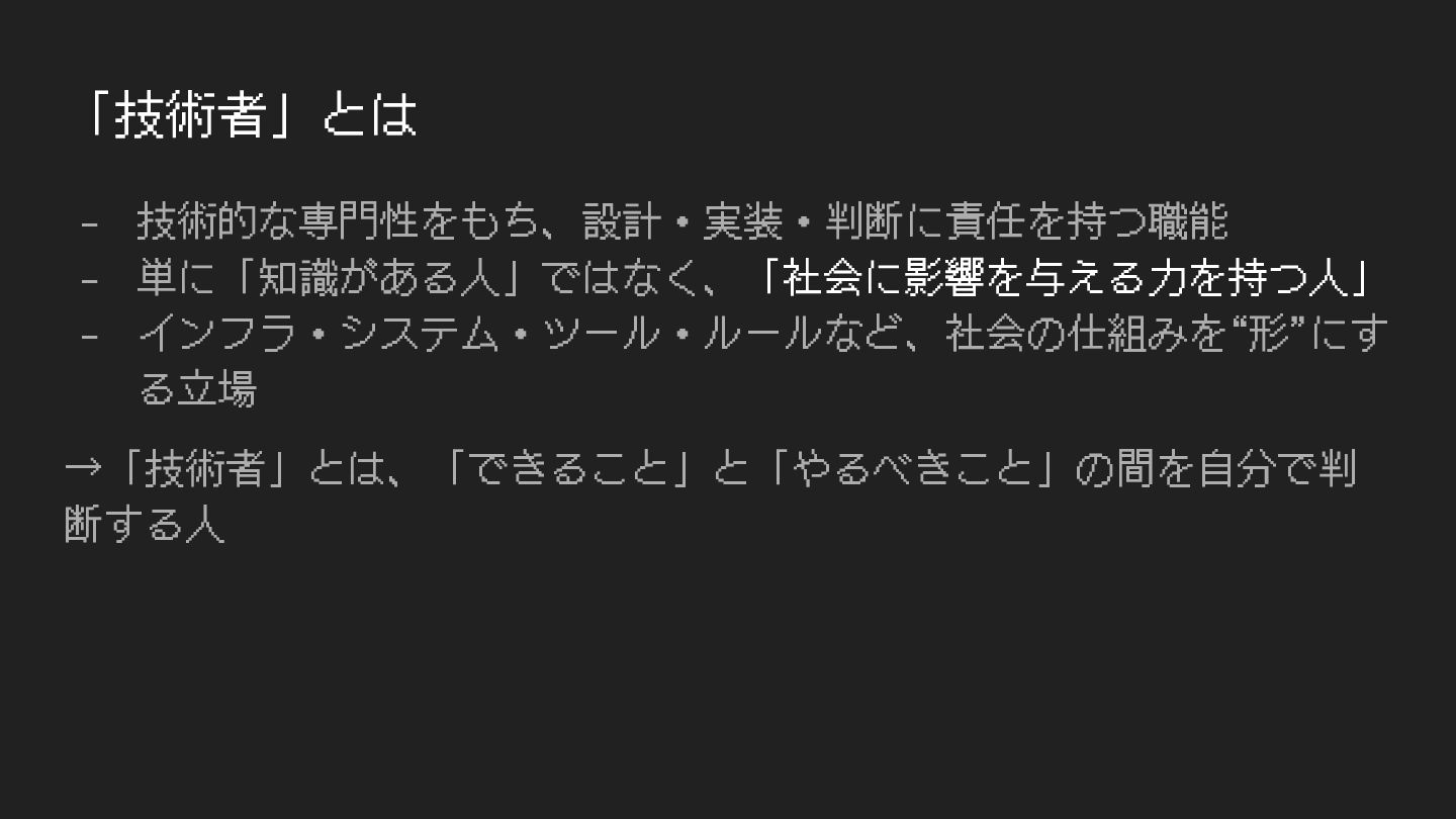 「技術者」とは - 技術的な専⾨性をもち、設計・実装・判断に責任を持つ職能 - 単に「知識がある⼈」ではなく、「社会に影響を与える⼒を持つ⼈」 - インフラ・システム・ツール・ルールなど、社会の仕組みを“形”にす る⽴場 →「技術者」とは、「できること」と「やるべきこと」の間を⾃分で判 断する⼈