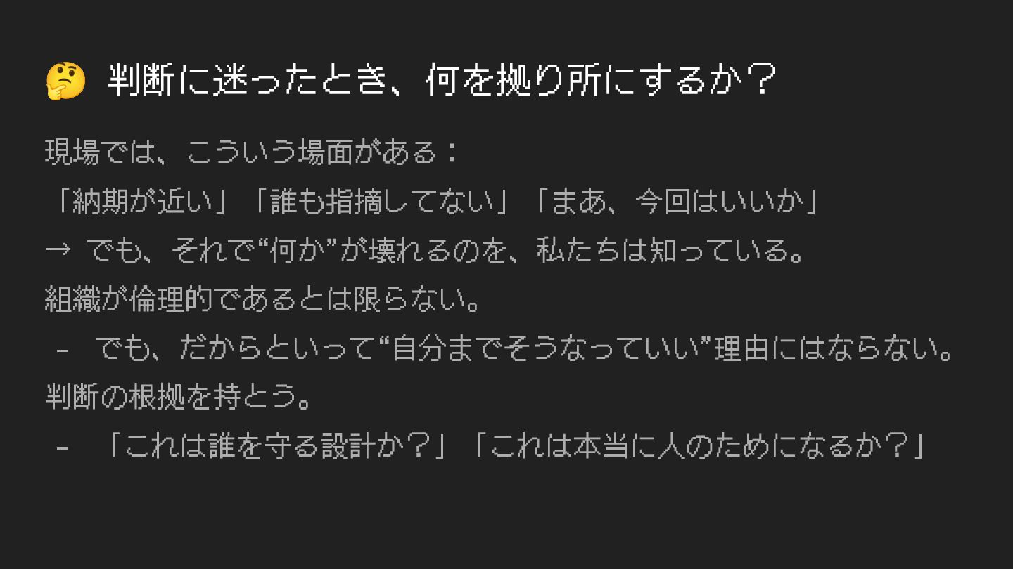 🤔 判断に迷ったとき、何を拠り所にするか? 現場では、こういう場⾯がある: 「納期が近い」「誰も指摘してない」「まあ、今回はいいか」 → でも、それで“何か”が壊れるのを、私たちは知っている。 組織が倫理的であるとは限らない。 - でも、だからといって“⾃分までそうなっていい”理由にはならない。 判断の根拠を持とう。