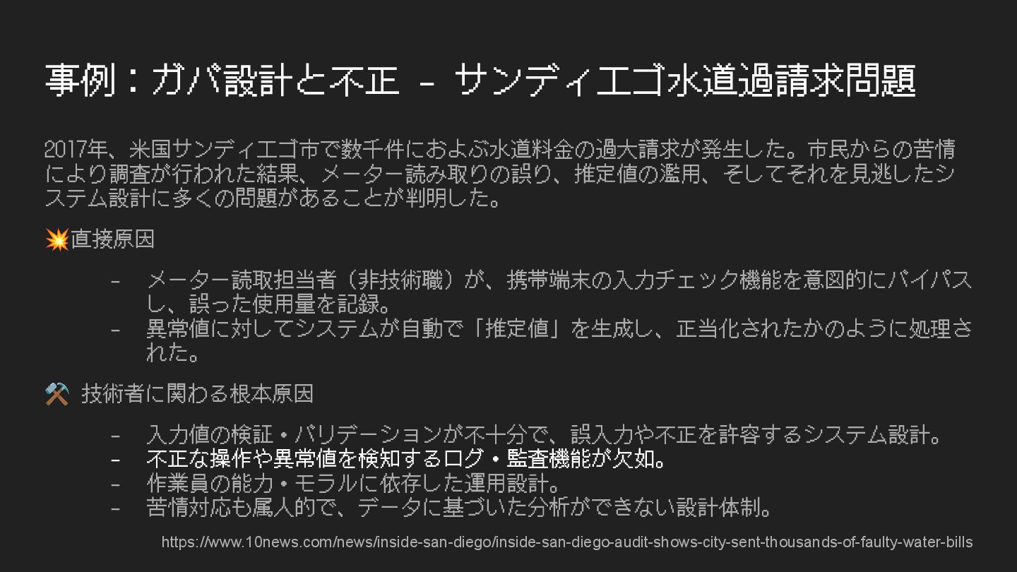 事例:ガバ設計と不正 - サンディエゴ⽔道過請求問題 2017年、⽶国サンディエゴ市で数千件におよぶ⽔道料⾦の過⼤請求が発⽣した。市⺠からの苦情 により調査が⾏われた結果、メーター読み取りの誤り、推定値の濫⽤、そしてそれを⾒逃したシ ステム設計に多くの問題があることが判明した。 💥直接原因 - メーター読取担当者(⾮技術職)が、携帯端末の⼊⼒チェック機能を意図的にバイパス し、誤った使⽤量を記録。