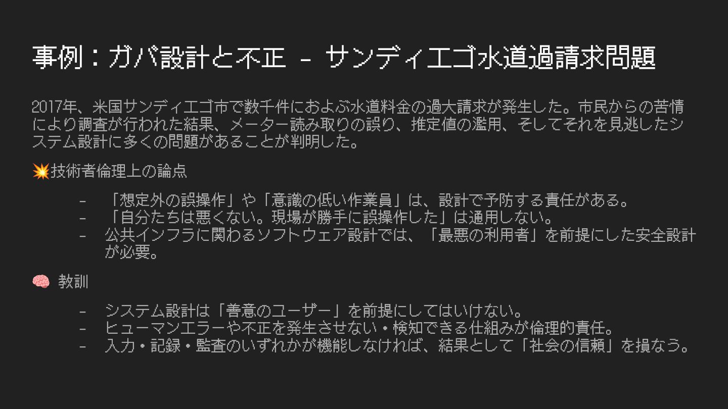 事例:ガバ設計と不正 - サンディエゴ⽔道過請求問題 2017年、⽶国サンディエゴ市で数千件におよぶ⽔道料⾦の過⼤請求が発⽣した。市⺠からの苦情 により調査が⾏われた結果、メーター読み取りの誤り、推定値の濫⽤、そしてそれを⾒逃したシ ステム設計に多くの問題があることが判明した。 💥技術者倫理上の論点 - 「想定外の誤操作」や「意識の低い作業員」は、設計で予防する責任がある。 -