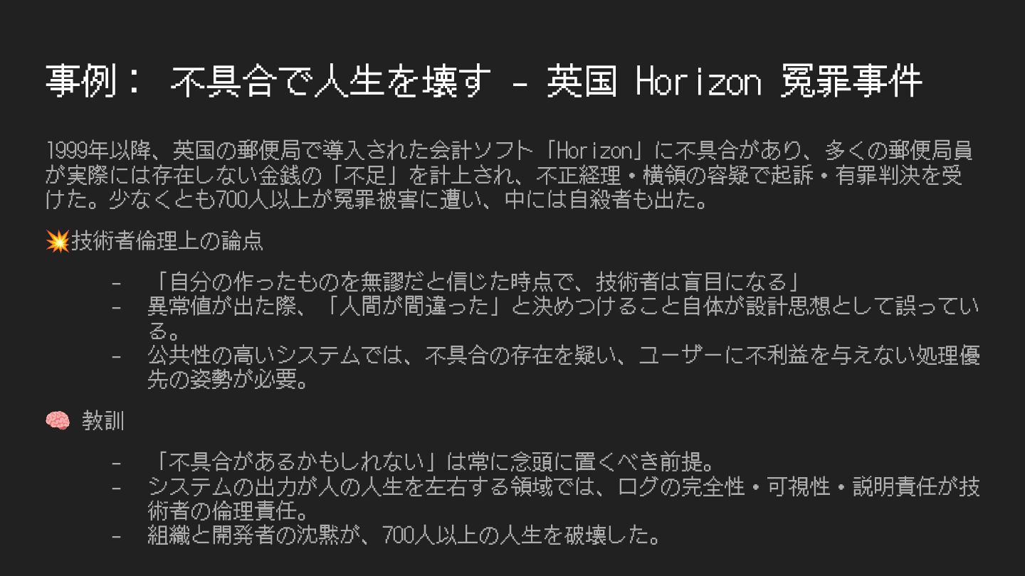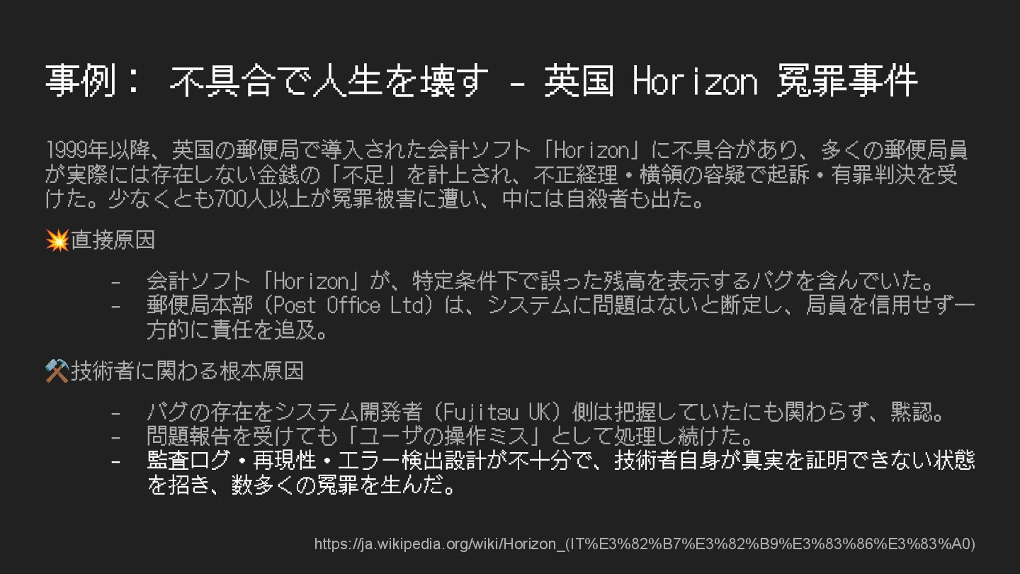 - 会計ソフト「Horizon」が、特定条件下で誤った残⾼を表⽰するバグを含んでいた。 - 郵便局本部(Post Office Ltd)は、システムに問題はないと断定し、局員を信⽤せず⼀ ⽅的に責任を追及。 ⚒技術者に関わる根本原因 - バグの存在をシステム開発者(Fujitsu UK)側は把握していたにも関わらず、黙認。 - 問題報告を受けても「ユーザの操作ミス」として処理し続けた。 - 監査ログ・再現性・エラー検出設計が不⼗分で、技術者⾃⾝が真実を証明できない状態 を招き、数多くの冤罪を⽣んだ。 https://ja.wikipedia.org/wiki/Horizon_(IT%E3%82%B7%E3%82%B9%E3%83%86%E3%83%A0)