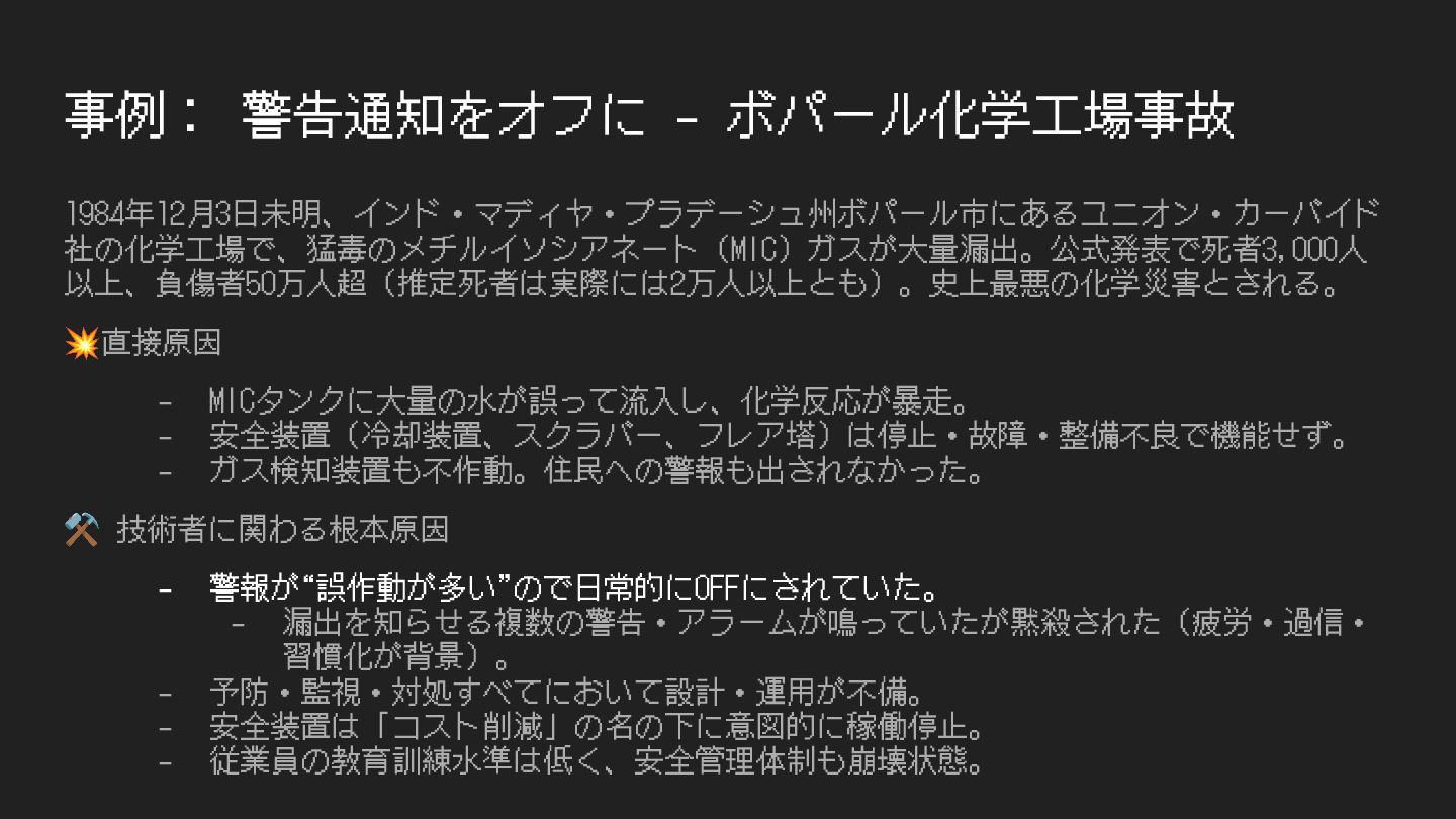 事例: 警告通知をオフに - ボパール化学⼯場事故 1984年12⽉3⽇未明、インド・マディヤ・プラデーシュ州ボパール市にあるユニオン・カーバイド 社の化学⼯場で、猛毒のメチルイソシアネート(MIC)ガスが⼤量漏出。公式発表で死者3,000⼈ 以上、負傷者50万⼈超(推定死者は実際には2万⼈以上とも)。史上最悪の化学災害とされる。 💥直接原因 - MICタンクに⼤量の⽔が誤って流⼊し、化学反応が暴⾛。