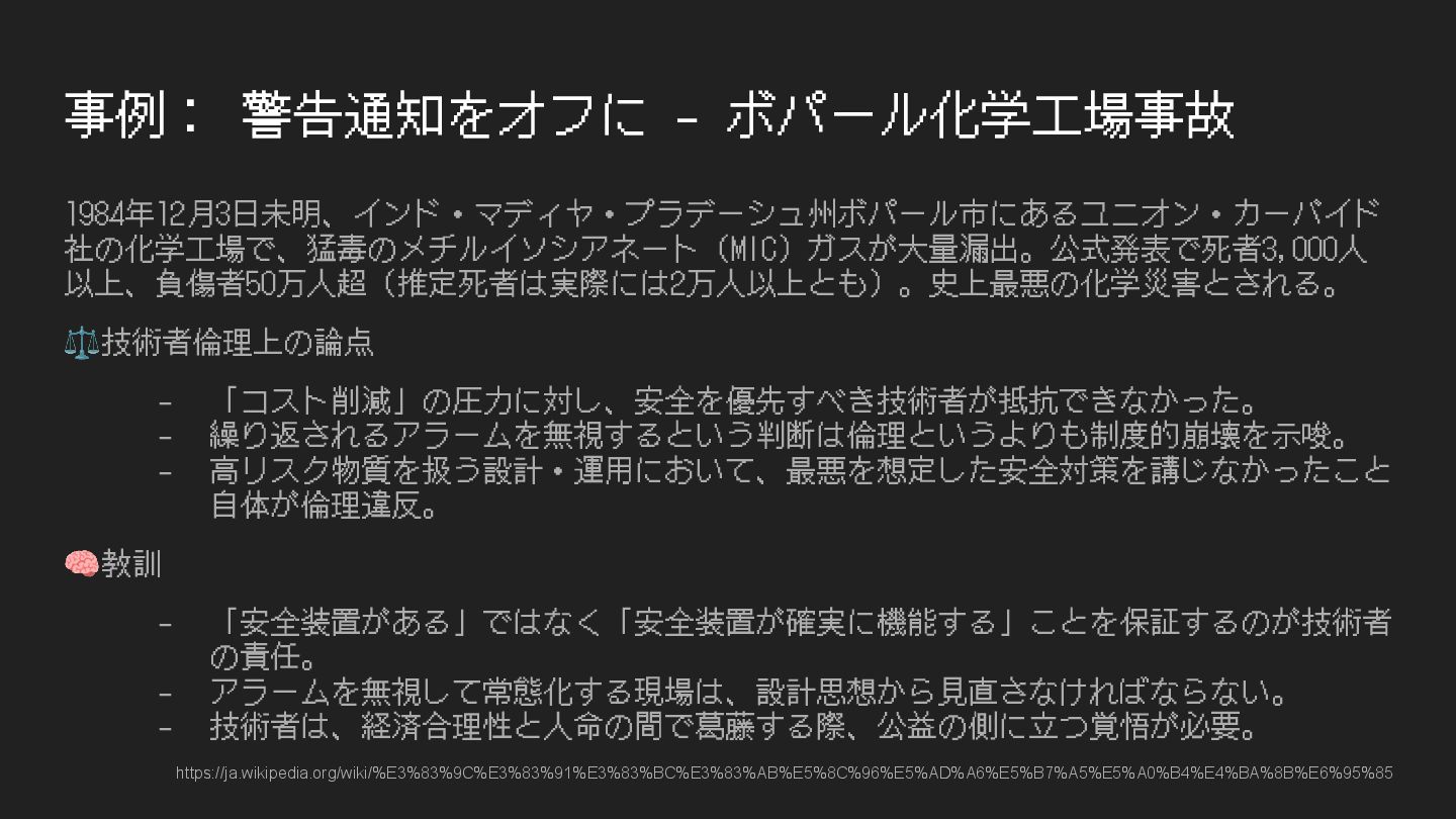 事例: 警告通知をオフに - ボパール化学⼯場事故 1984年12⽉3⽇未明、インド・マディヤ・プラデーシュ州ボパール市にあるユニオン・カーバイド 社の化学⼯場で、猛毒のメチルイソシアネート(MIC)ガスが⼤量漏出。公式発表で死者3,000⼈ 以上、負傷者50万⼈超(推定死者は実際には2万⼈以上とも)。史上最悪の化学災害とされる。 ⚖技術者倫理上の論点 - 「コスト削減」の圧⼒に対し、安全を優先すべき技術者が抵抗できなかった。