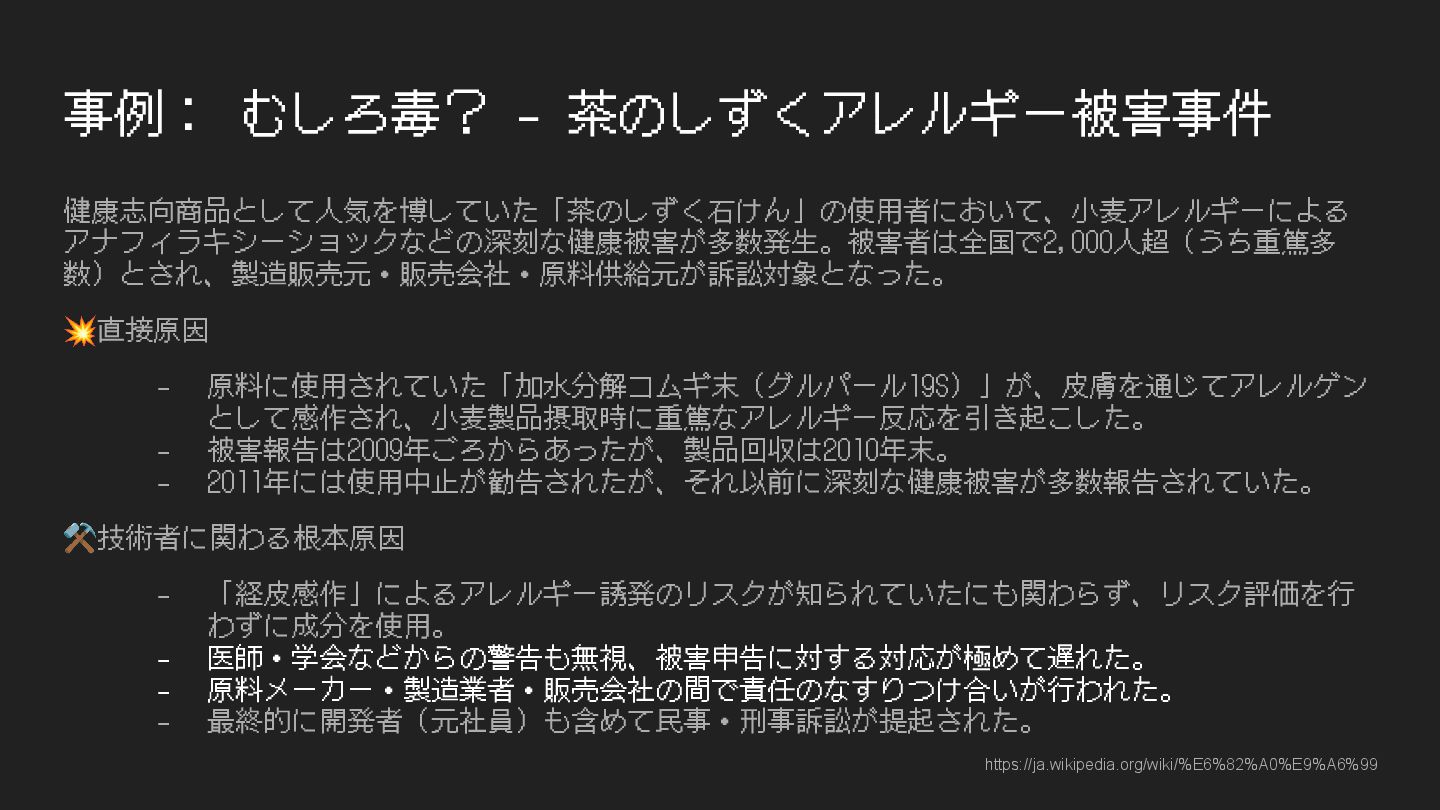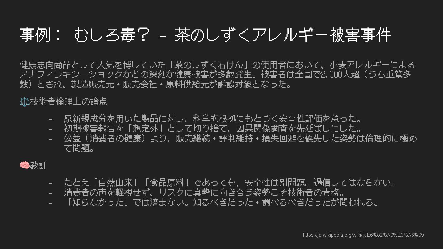 事例: むしろ毒? - 茶のしずくアレルギー被害事件 健康志向商品として⼈気を博していた「茶のしずく⽯けん」の使⽤者において、⼩⻨アレルギーによる アナフィラキシーショックなどの深刻な健康被害が多数発⽣。被害者は全国で2,000⼈超(うち重篤多 数)とされ、製造販売元・販売会社・原料供給元が訴訟対象となった。 ⚖技術者倫理上の論点 - 原新規成分を⽤いた製品に対し、科学的根拠にもとづく安全性評価を怠った。