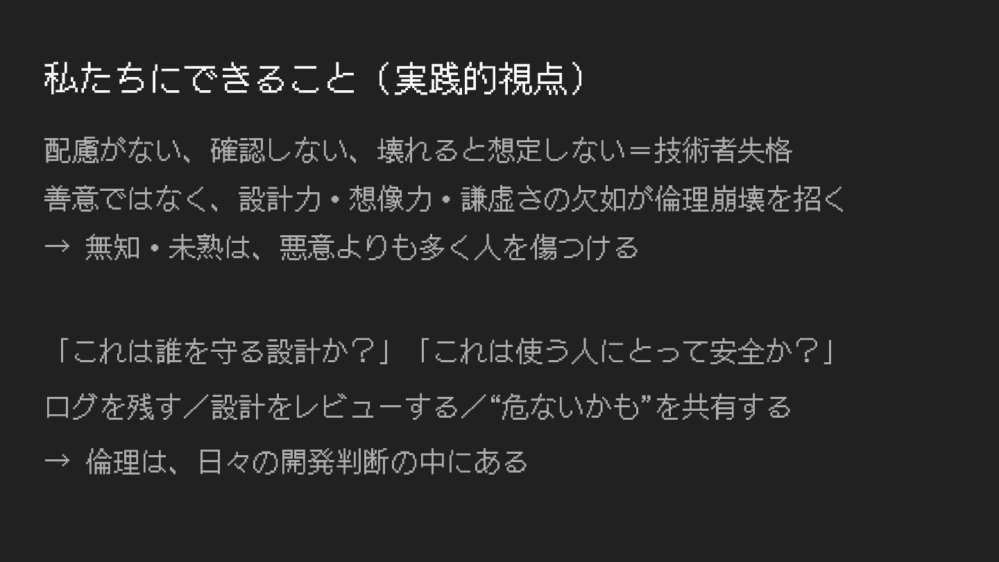 私たちにできること(実践的視点) 配慮がない、確認しない、壊れると想定しない=技術者失格 善意ではなく、設計⼒・想像⼒・謙虚さの⽋如が倫理崩壊を招く → 無知・未熟は、悪意よりも多く⼈を傷つける 「これは誰を守る設計か?」「これは使う⼈にとって安全か?」 ログを残す/設計をレビューする/“危ないかも”を共有する → 倫理は、⽇々の開発判断の中にある