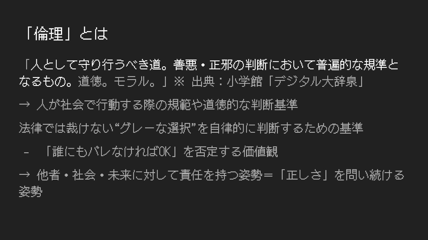 「倫理」とは 「⼈として守り⾏うべき道。善悪・正邪の判断において普遍的な規準と なるもの。道徳。モラル。」※ 出典:⼩学館「デジタル⼤辞泉」 → ⼈が社会で⾏動する際の規範や道徳的な判断基準 法律では裁けない“グレーな選択”を⾃律的に判断するための基準 - 「誰にもバレなければOK」を否定する価値観 →