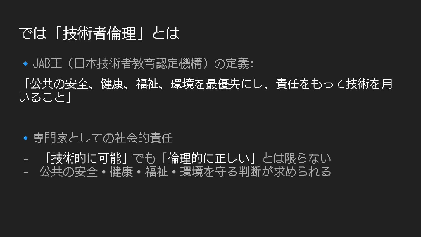では「技術者倫理」とは 🔹JABEE(⽇本技術者教育認定機構)の定義: 「公共の安全、健康、福祉、環境を最優先にし、責任をもって技術を⽤ いること」 🔹専⾨家としての社会的責任 - 「技術的に可能」でも「倫理的に正しい」とは限らない - 公共の安全・健康・福祉・環境を守る判断が求められる