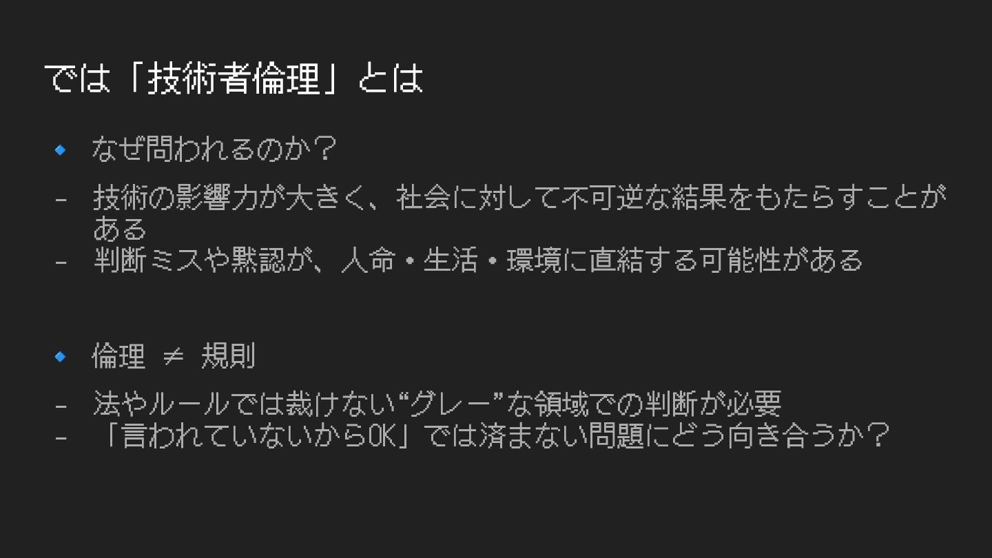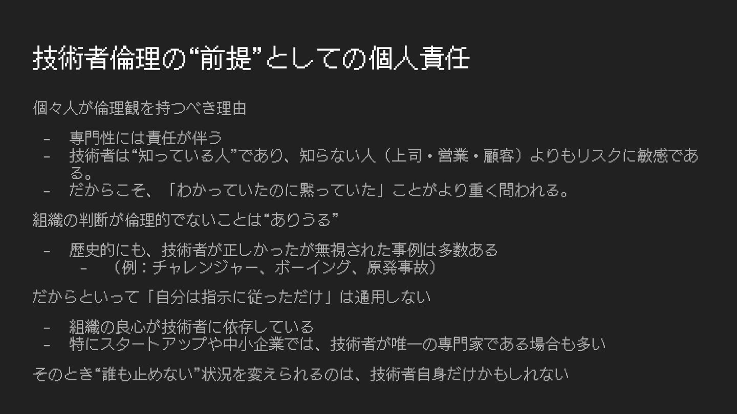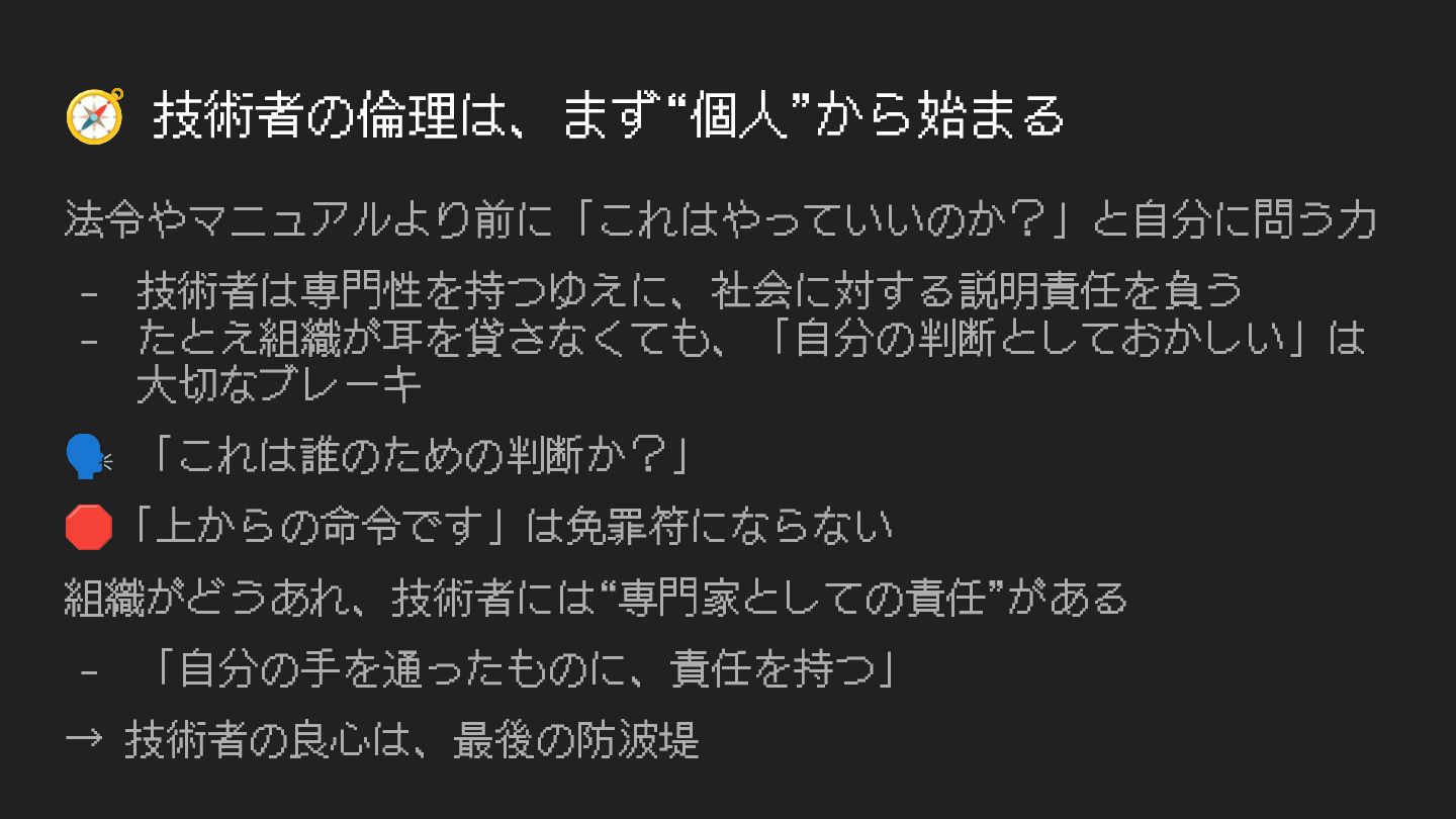 🧭 技術者の倫理は、まず“個⼈”から始まる 法令やマニュアルより前に「これはやっていいのか?」と⾃分に問う⼒ - 技術者は専⾨性を持つゆえに、社会に対する説明責任を負う - たとえ組織が⽿を貸さなくても、「⾃分の判断としておかしい」は ⼤切なブレーキ 🗣 「これは誰のための判断か?」