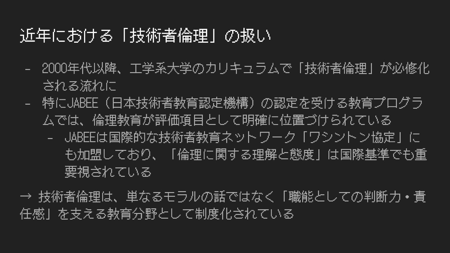 要視されている → 技術者倫理は、単なるモラルの話ではなく「職能としての判断⼒・責 任感」を⽀える教育分野として制度化されている