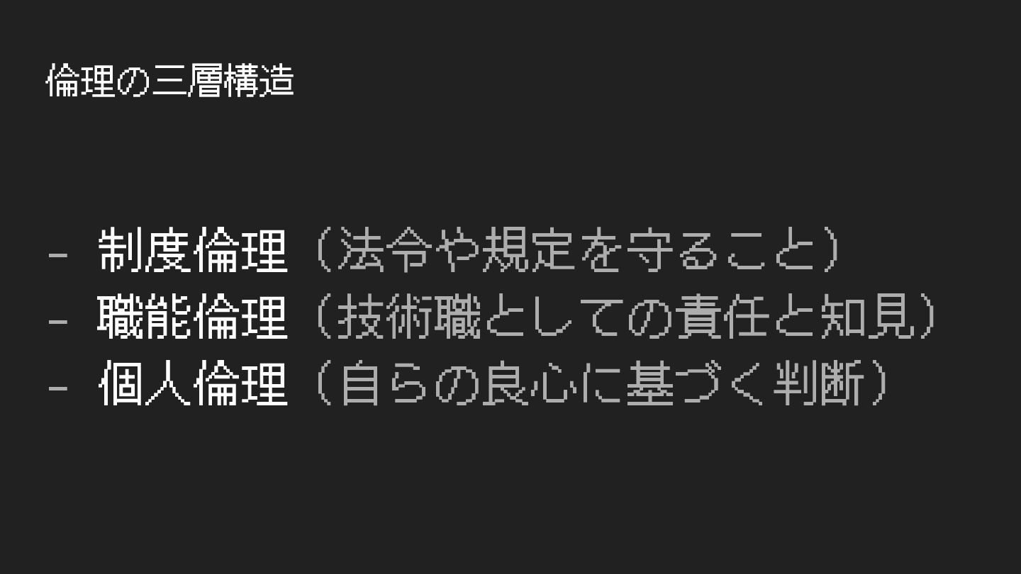 倫理の三層構造 - 制度倫理(法令や規定を守ること) - 職能倫理(技術職としての責任と知⾒) - 個⼈倫理(⾃らの良⼼に基づく判断)