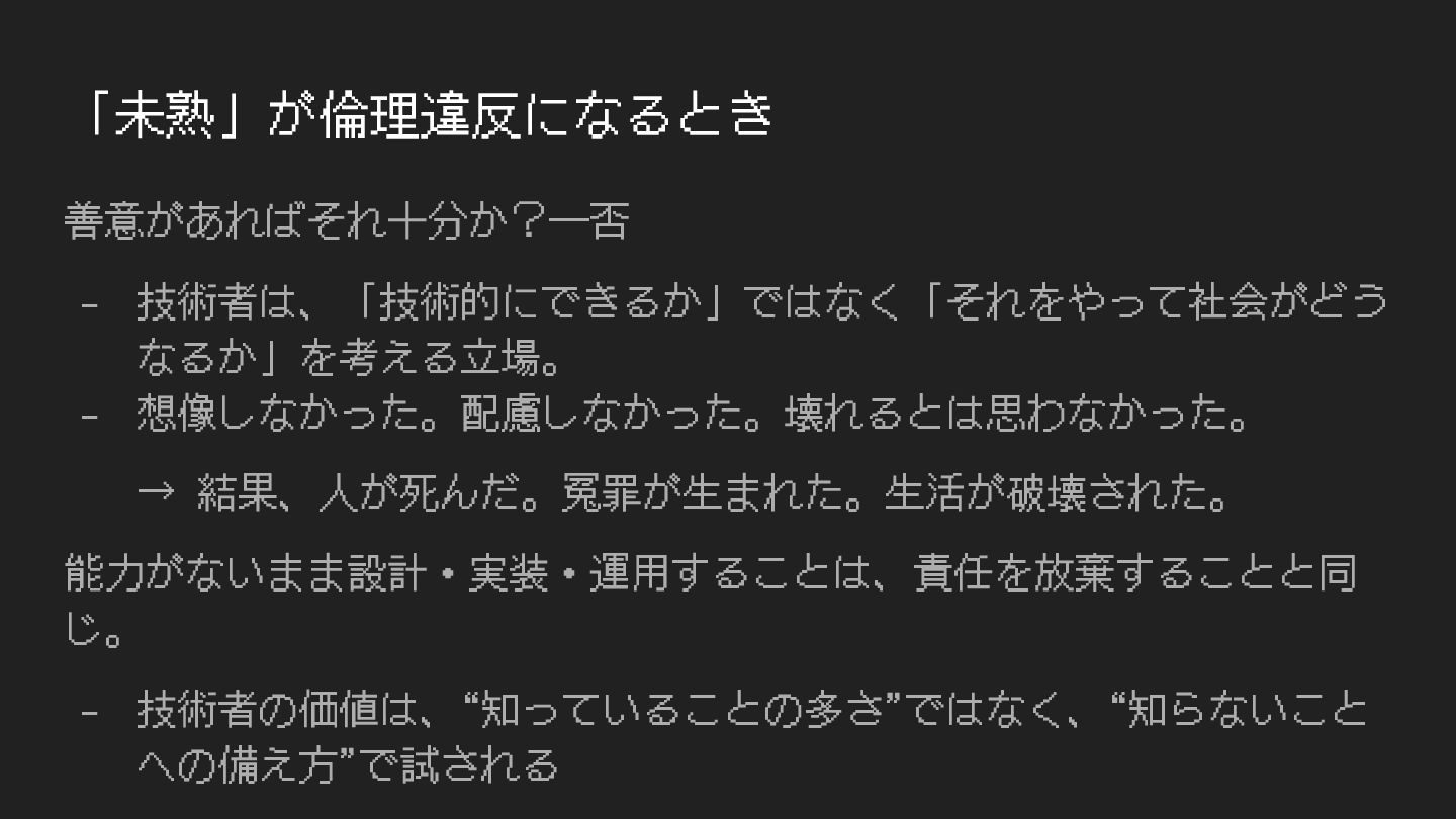 「未熟」が倫理違反になるとき 善意があればそれ⼗分か?―否 - 技術者は、「技術的にできるか」ではなく「それをやって社会がどう なるか」を考える⽴場。 - 想像しなかった。配慮しなかった。壊れるとは思わなかった。 → 結果、⼈が死んだ。冤罪が⽣まれた。⽣活が破壊された。 能⼒がないまま設計・実装・運⽤することは、責任を放棄することと同