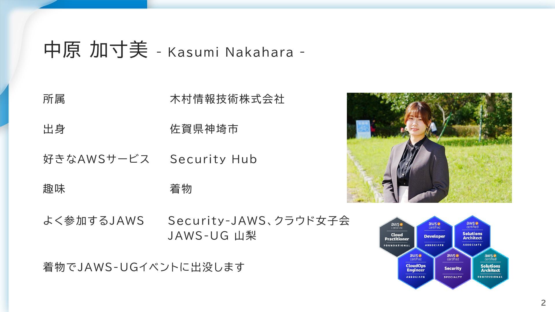 好きなAWSサービス Security Hub 趣味 着物 よく参加するJAWS Security-JAWS、クラウド女子会 JAWS-UG 山梨 着物でJAWS-UGイベントに出没します 2