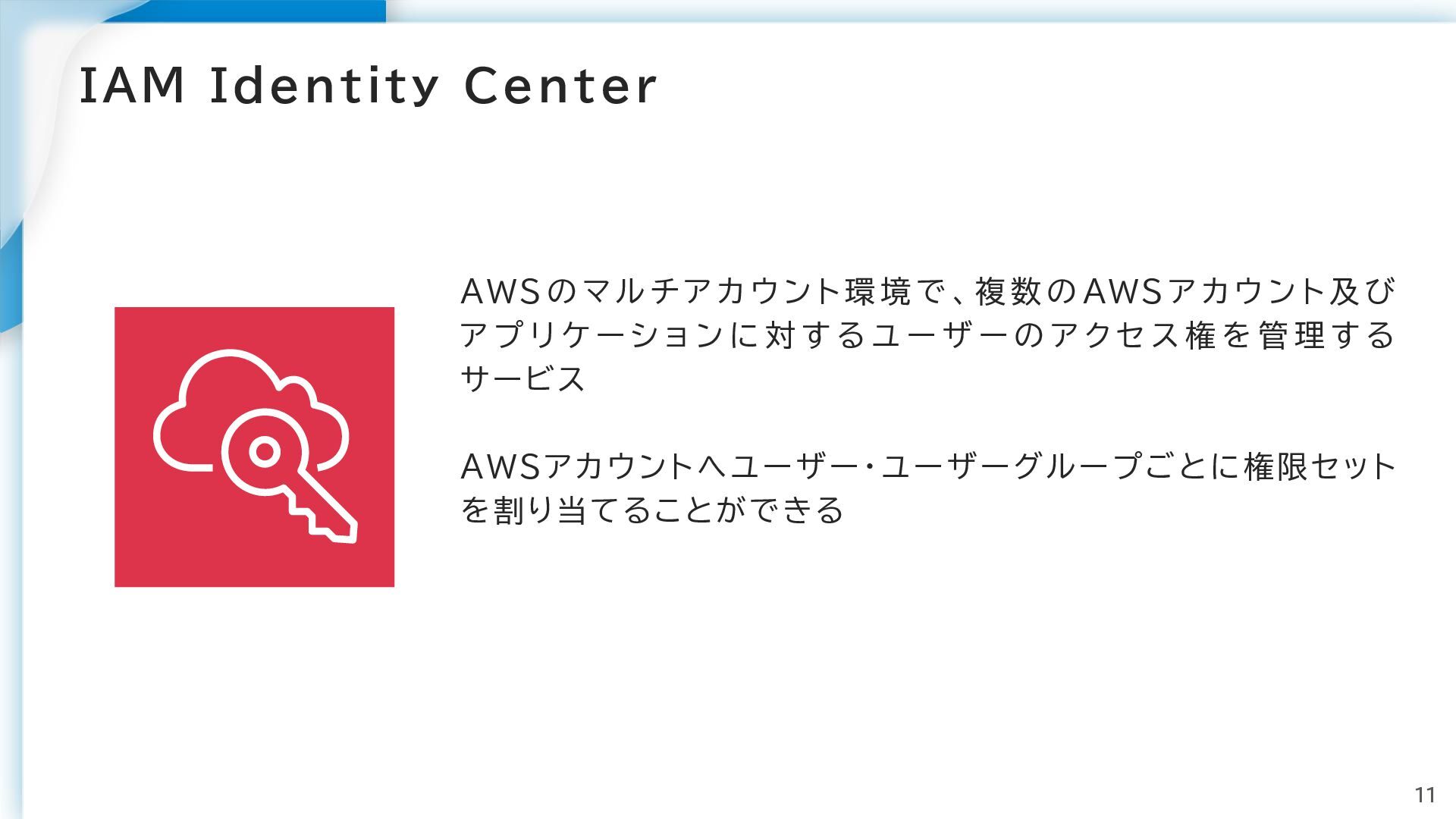 IAM AWS の認証・認可を司るサービス 各AWSリソースへアクセス権限を付与できる ユーザー・グループ・ロールへ権限を付与し、各AWSリソースや ヒューマンユーザーへのアクセス制御を行うことができる 10