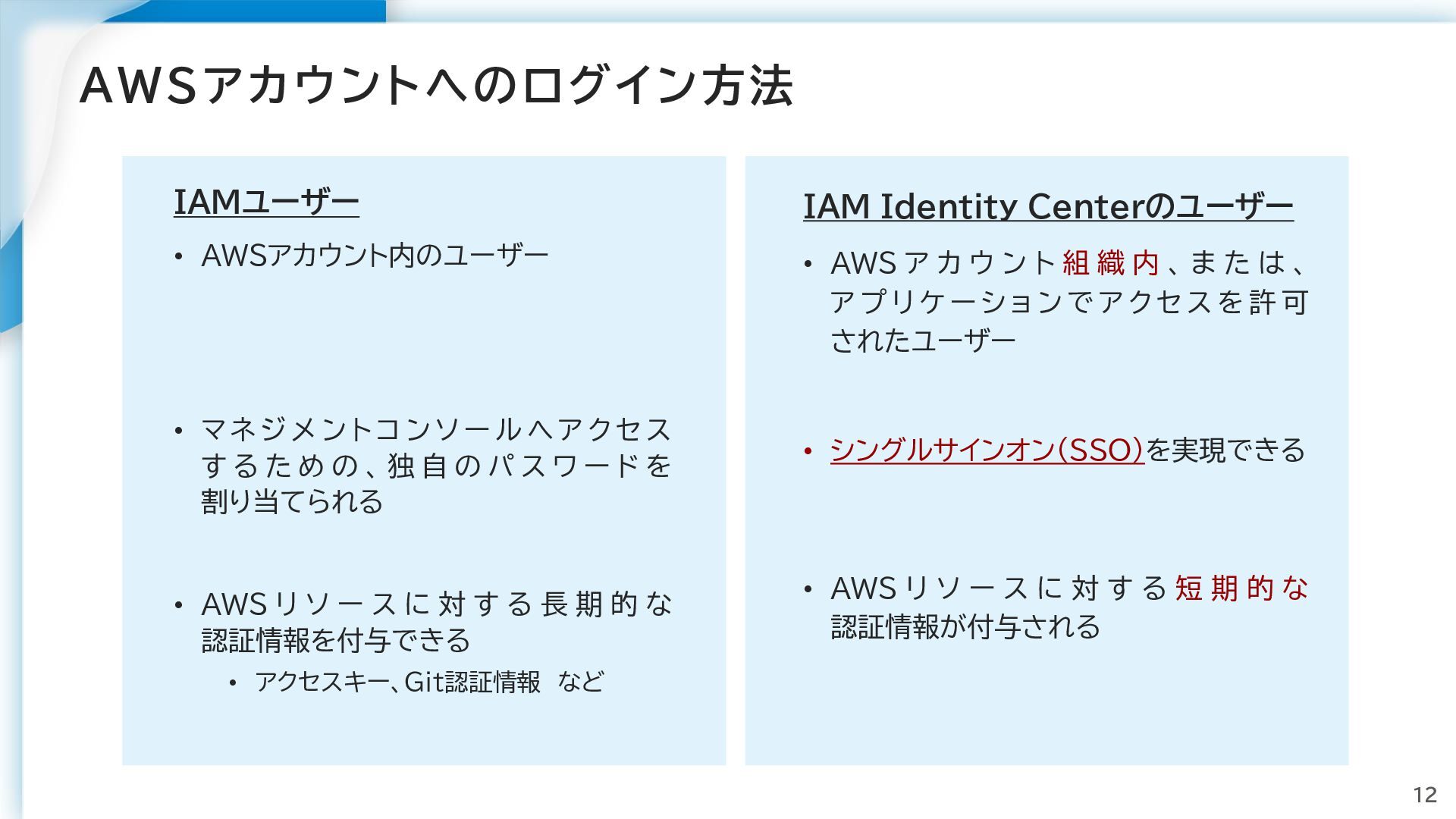 ン ト コ ン ソ ー ル へ ア ク セ ス す る た め の 、 独 自 の パ ス ワ ー ド を 割り当てられる • AWS リ ソ ー ス に 対 す る 長 期 的 な 認証情報を付与できる • アクセスキー、Git認証情報 など IAM Identity Centerのユーザー • AWS ア カ ウ ン ト 組 織 内 、 ま た は 、 ア プ リ ケ ー シ ョ ン で ア ク セ ス を 許 可 されたユーザー • シングルサインオン(SSO)を実現できる • AWS リ ソ ー ス に 対 す る 短 期 的 な 認証情報が付与される