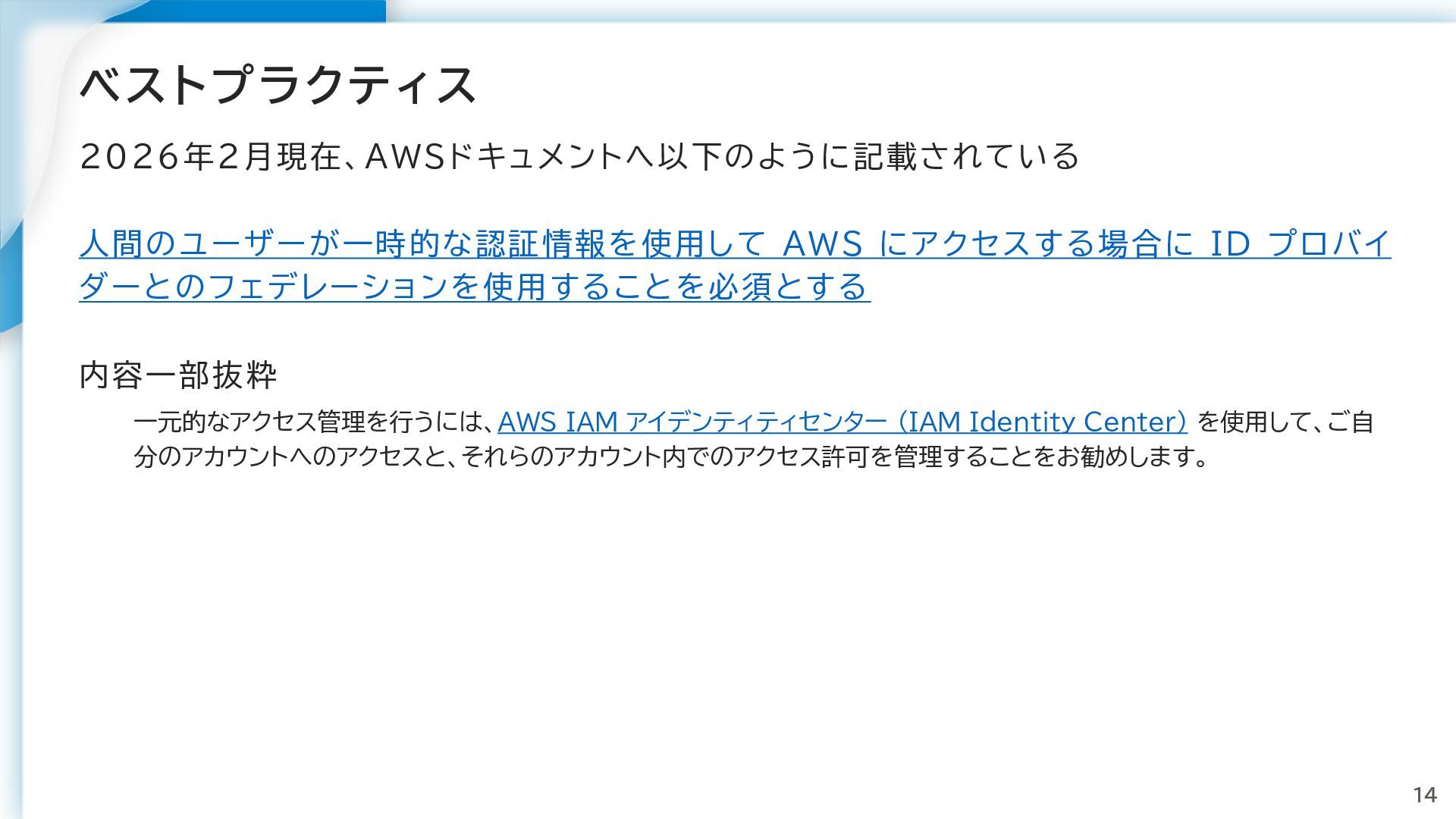ベストプラクティス 2026年2月現在、AWSドキュメントへ以下のように記載されている 人間のユーザーが一時的な認証情報を使用して AWS にアクセスする場合に ID プロバイ ダーとのフェデレーションを使用することを必須とする 内容一部抜粋 一元的なアクセス管理を行うには、AWS