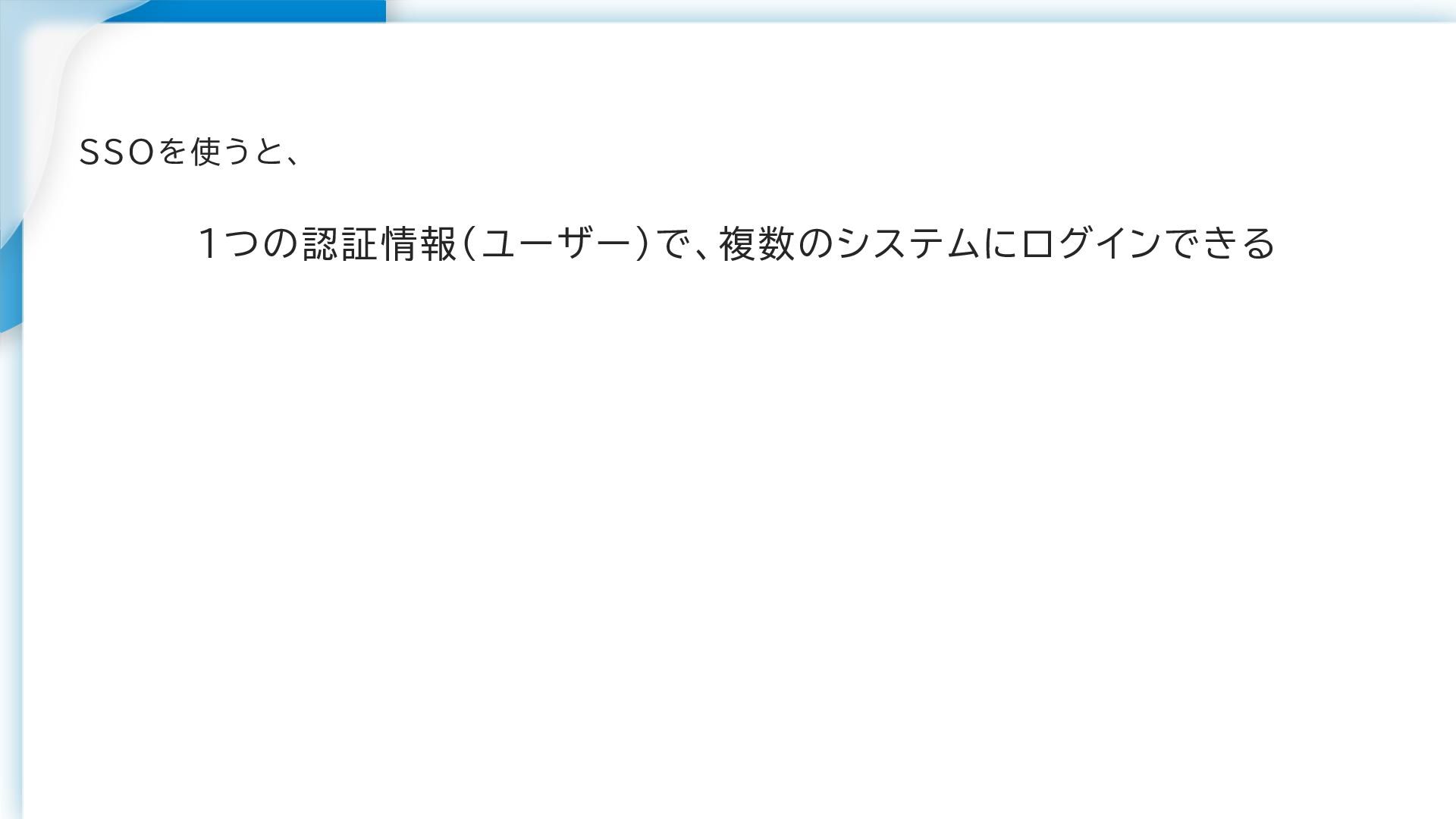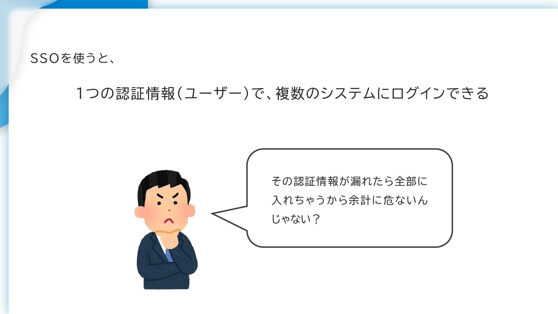 SSOを使うと、 1つの認証情報(ユーザー)で、複数のシステムにログインできる その認証情報が漏れたら全部に 入れちゃうから余計に危ないん じゃない?