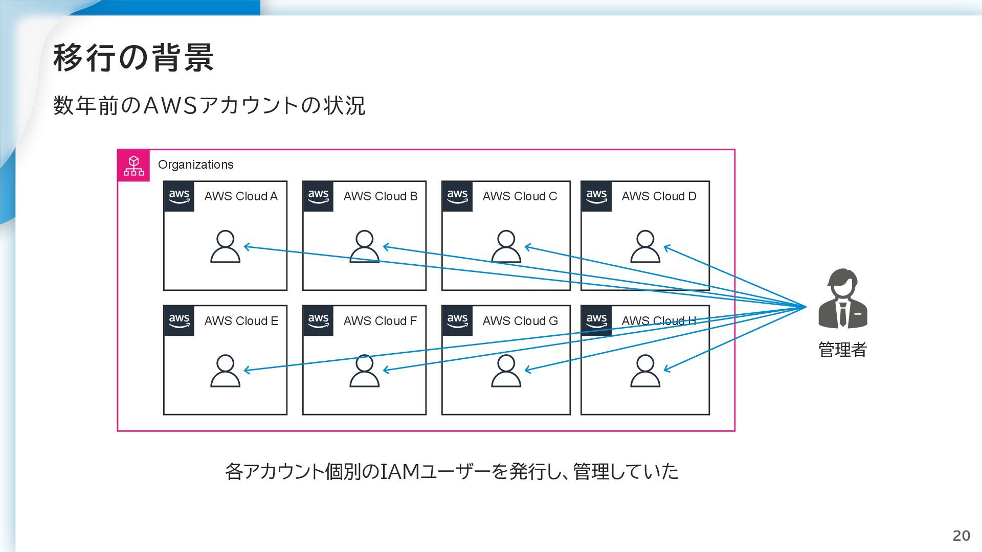 AWS Cloud E AWS Cloud F AWS Cloud C AWS Cloud D AWS Cloud G AWS Cloud H 管理者 各アカウント個別のIAMユーザーを発行し、管理していた