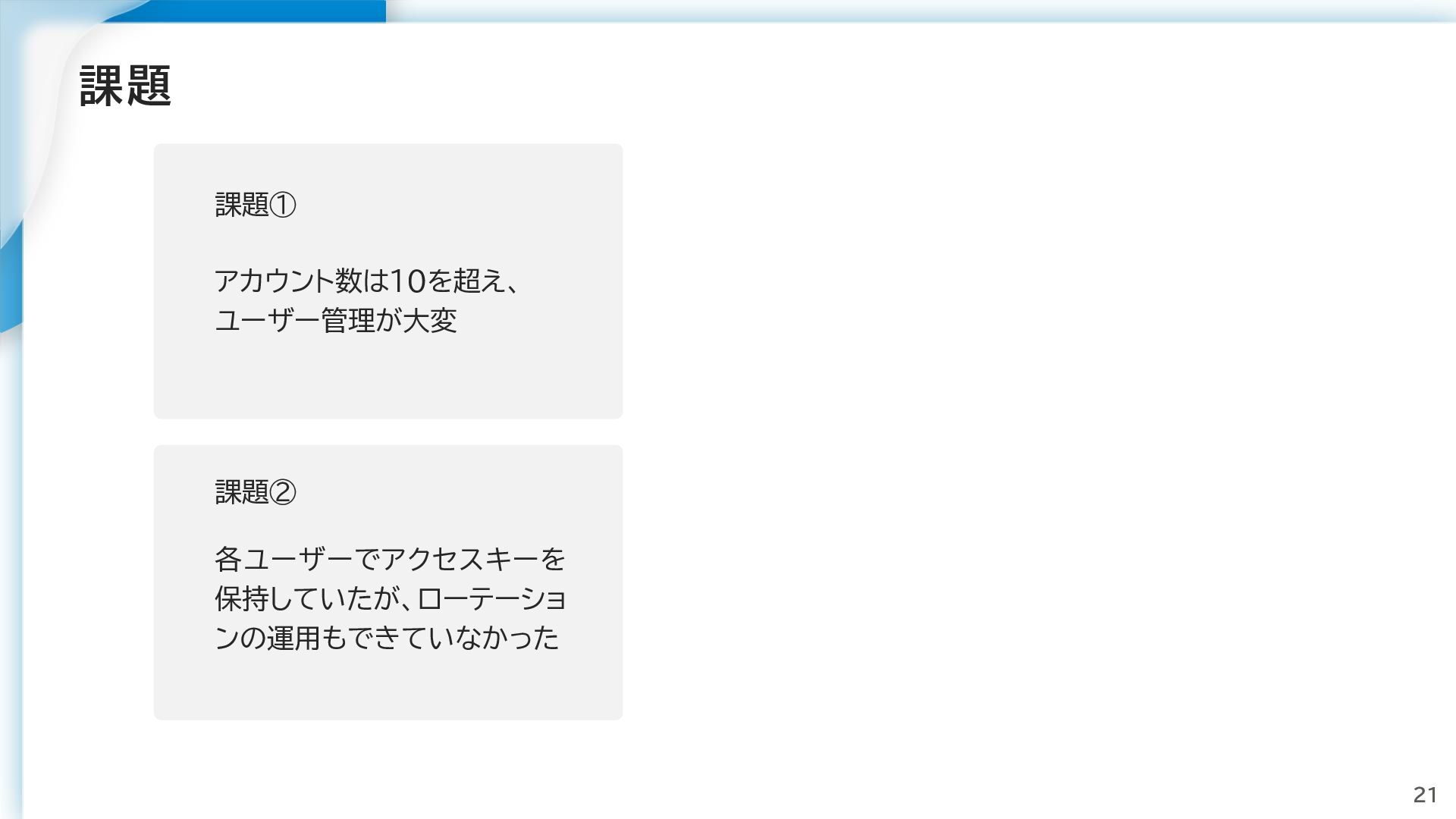 課題 22 課題① アカウント数は10を超え、 ユーザー管理が大変 課題② 各ユーザーでアクセスキーを 保持していたが、ローテーショ ンの運用もできていなかった セキュリティ推進チーム