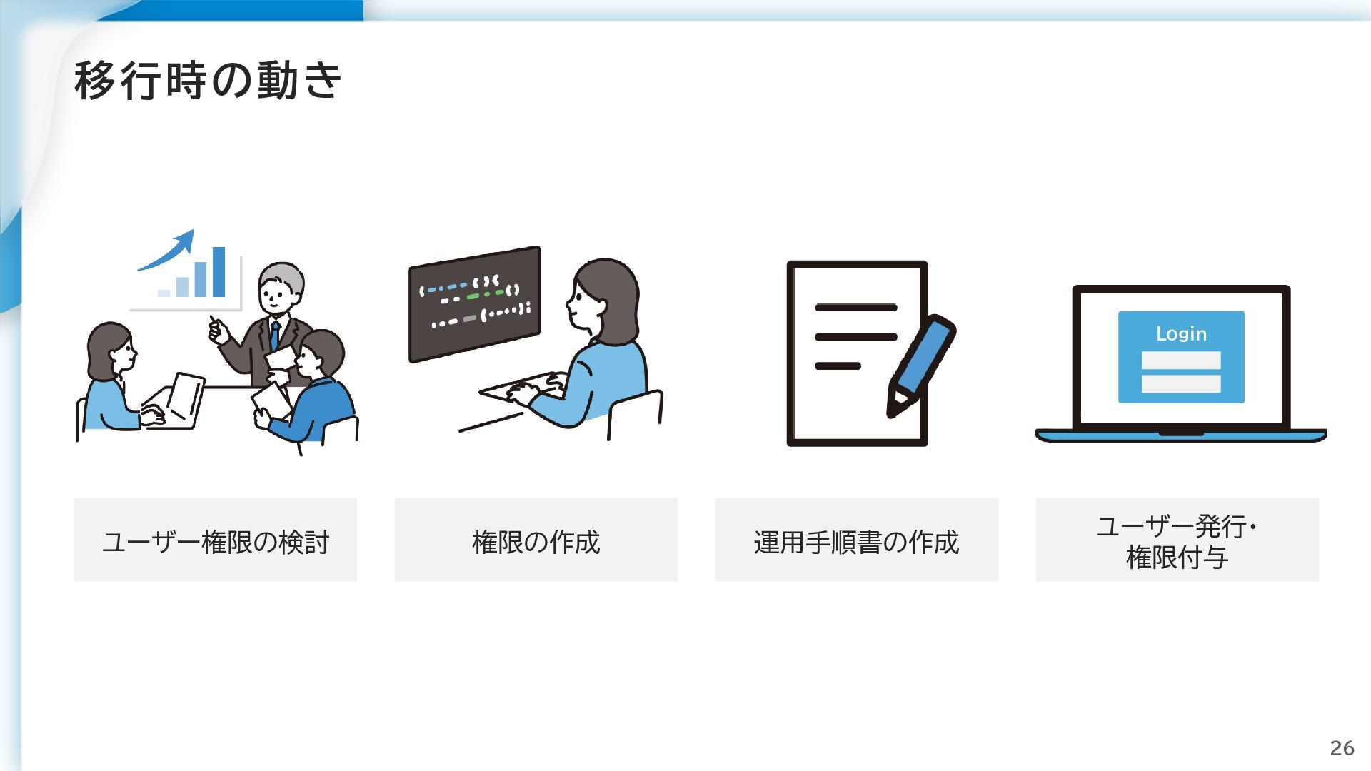 移行時の動き 26 ユーザー権限の検討 権限の作成 運用手順書の作成 ユーザー発行・ 権限付与 Login
