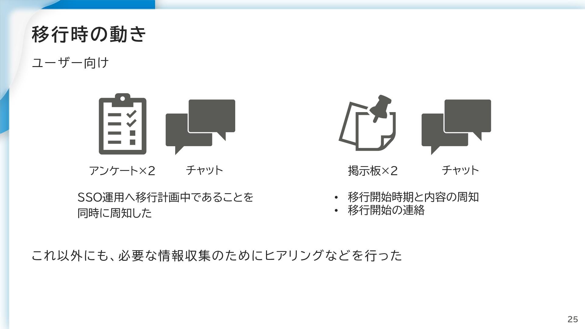 気を付けたこと こまめに周知する • IAMユーザーを利用しているユーザーは約百数十名 • 周知して進めないと混乱が生まれると想定された アンケート 掲示板 チャット