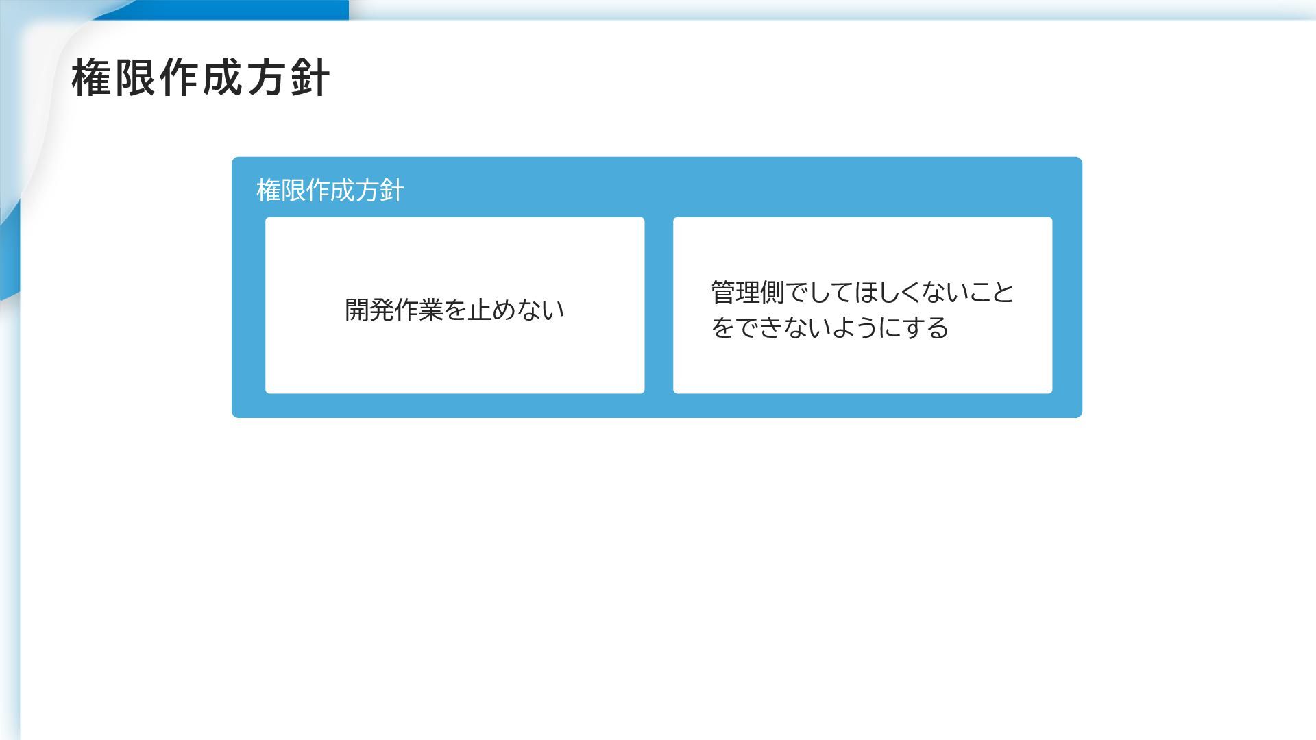 権限作成方針 開発作業を止めない 管理側でしてほしくないこと をできないようにする ガードレール 基本方針 利用者が手を止めることなく、セキュアに利用できる状態を目指す 権限作成方針
