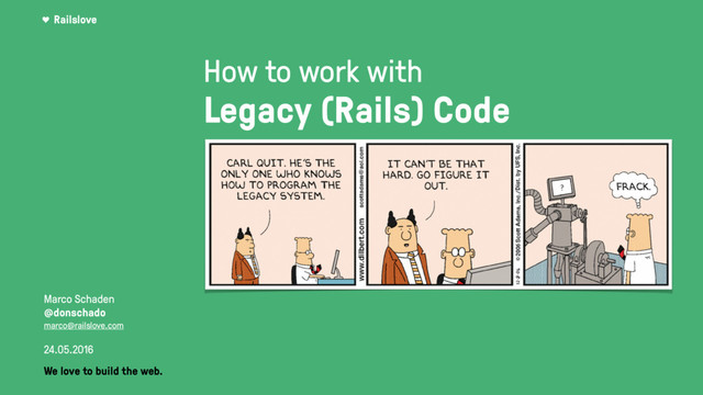 This talk will cover the main problems, that lead to legacy code and provide some guidance, tools and patterns, which can help you to work with legacy code and how to avoid it the next time.