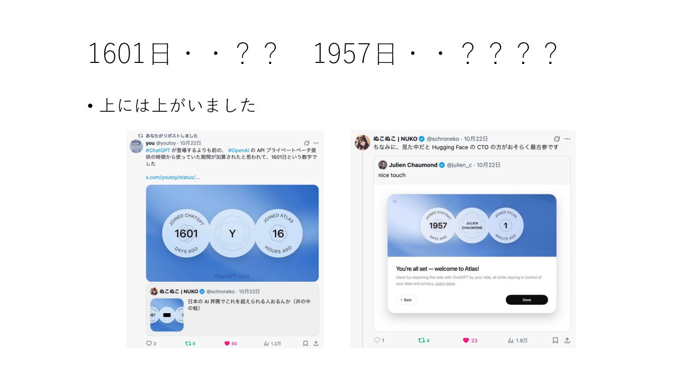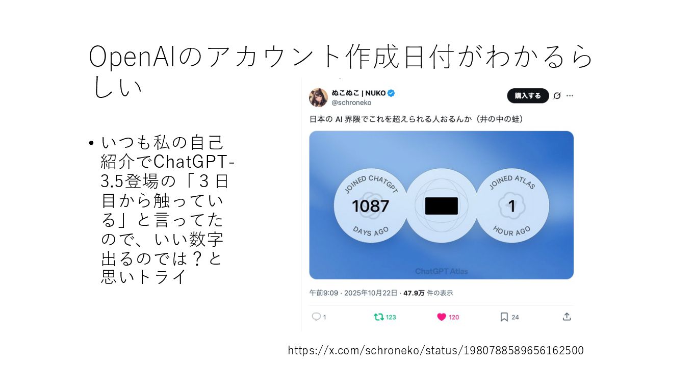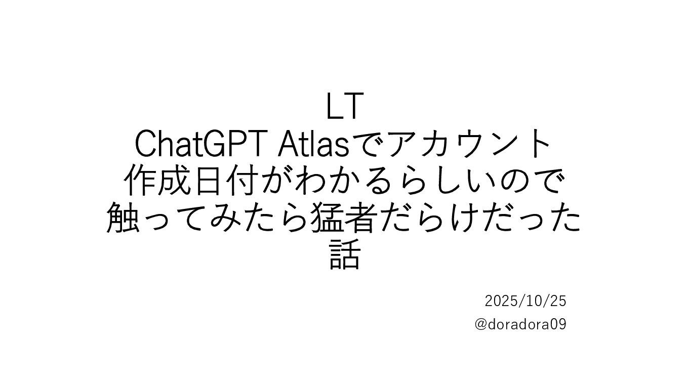 LT ChatGPT Atlasでアカウント 作成⽇付がわかるらしいので 触ってみたら猛者だらけだった 話 2025/10/25 @doradora09